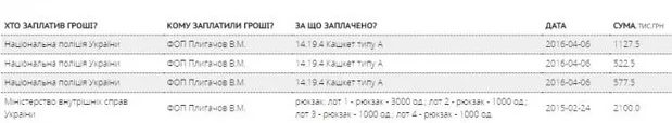 Согласно ей Национальная полиция заключила три соглашения с Владимиром Плыгачовим на поставку форменных фуражек. В то же время Плыгачов был посредником в закупке 1 тысячи рюкзаков для бойцов АТО. Кроме рюкзаков и фуражек для МВД, Плыгачов больше не выигрывал тендеров.