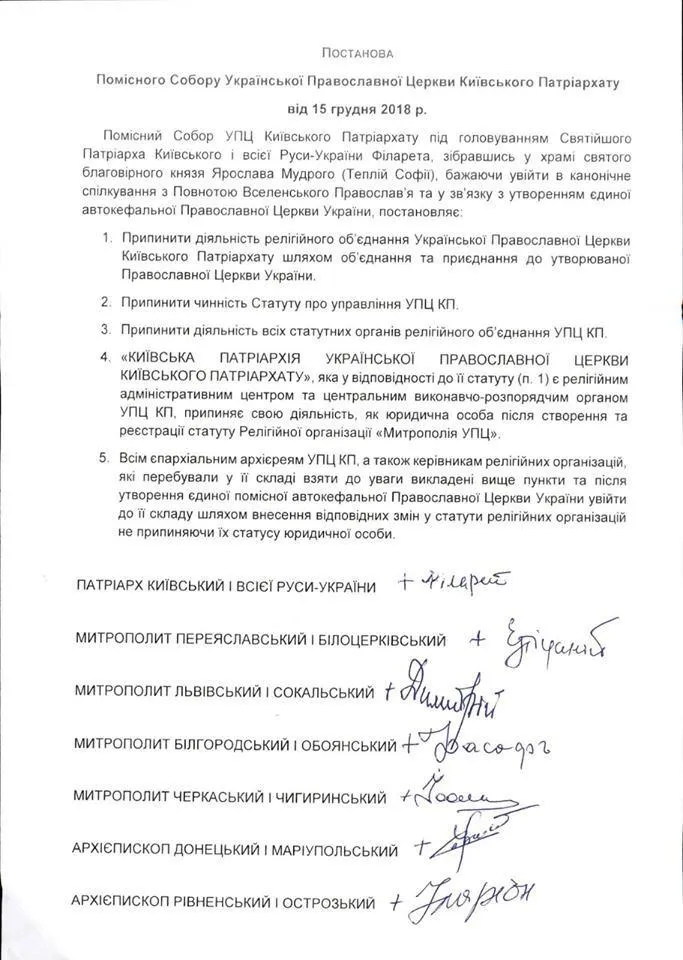 Постановление Собора УПЦ КП о создании Православной церкви Украины