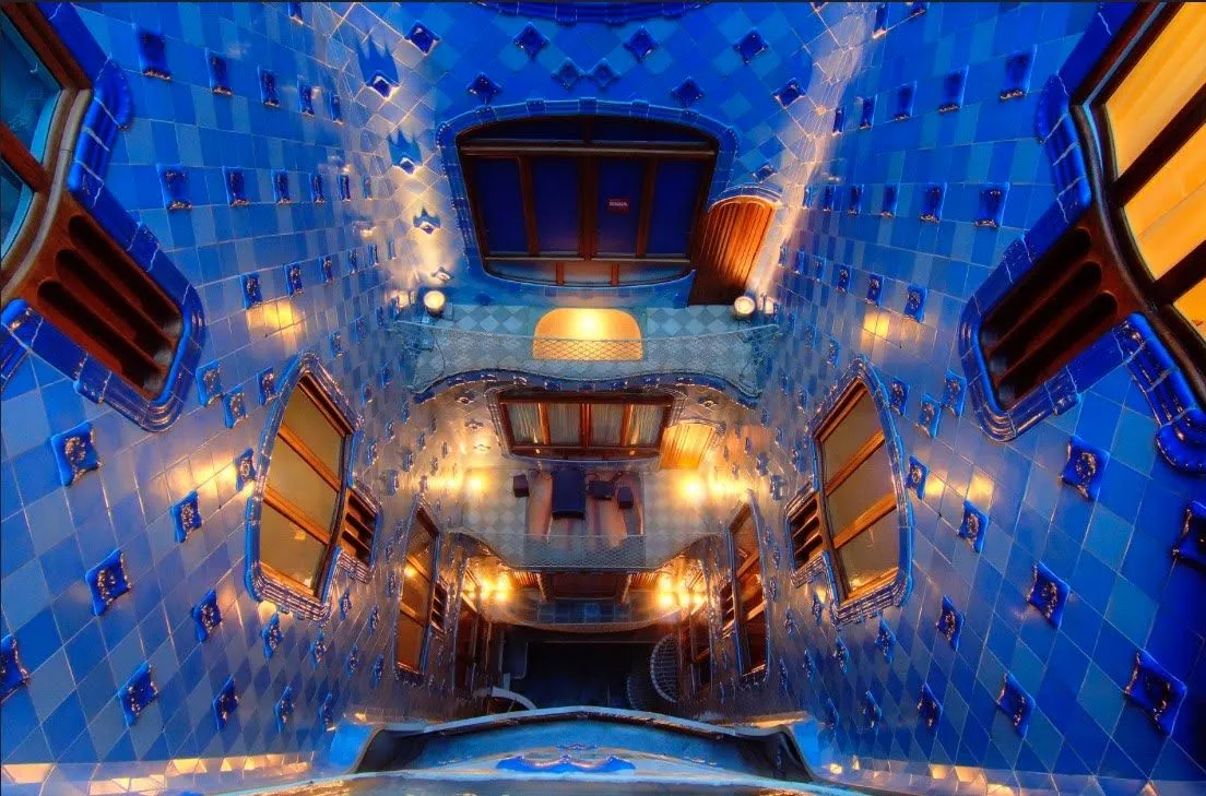 Крыши-драконы, балконы-черепа, фасад как вибрирующая мембрана, колонны-стволы, помещения-пещеры, оконные импосты, напоминающие кости, цветы, застывшие в рельефной керамике. И никаких, никаких прямых линий. Почему? Ответ Гауди прост: "Природа не знает прямых линий".