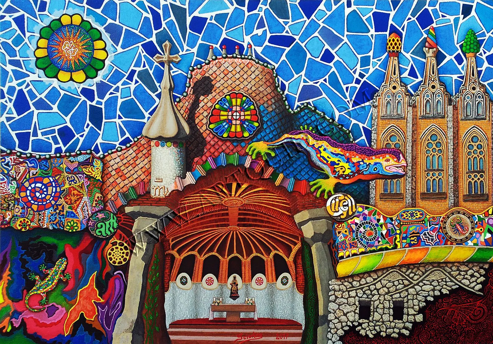 Следуя воображению и идеи естественных форм, Гауди создал фантастический парк с удивительными животными, мозаичным убранством, домами, которые кажется покрыты глазурью, колоннами, которые превращаются в деревья.
