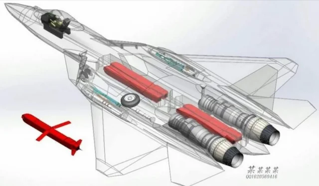 Су-57 имеет несколько внутренних точек подвески: центральный отсек фюзеляжа, рассчитан на крылатые ракеты большой дальности, и боковые отсеки в корневой части крыла для ракет "воздух-воздух". Конфигурация нагрузки может меняться в зависимости от задачи.