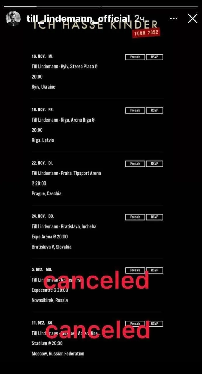 Об отмененных выступлениях он сообщил на своей странице в инстаграме. Следующую публикацию он выставил на фоне надписи "Киев" при въезде в украинскую столицу.