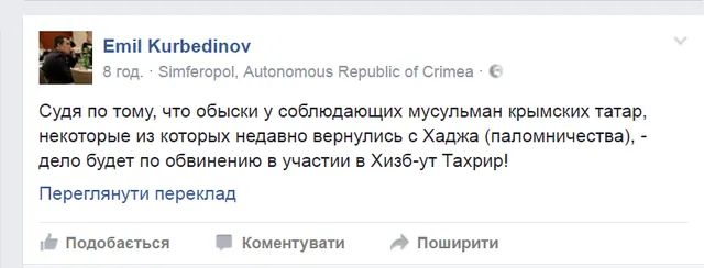 Также об обысках написал и адвокат Эмиль Курбединов. Он говорит, что обыскивают тех крымских татар, которые недавно вернулись с традиционного паломничества Хаджа. И предполагает, что их обвинят в участии в террористической организации.