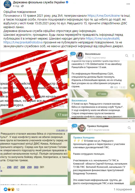 Ранее народные депутаты Андрей Холодов и Ольга Василевская-Смаглюк, занимающие руководящие посты в данном парламентском комитете, распространили информацию о том, что сотрудники ГФС стали участниками массовой драки со стрельбой в ночь на 15 мая в клубе “Культ” на Позняках. Данную информацию опровергли в пресс-службе ГФС.