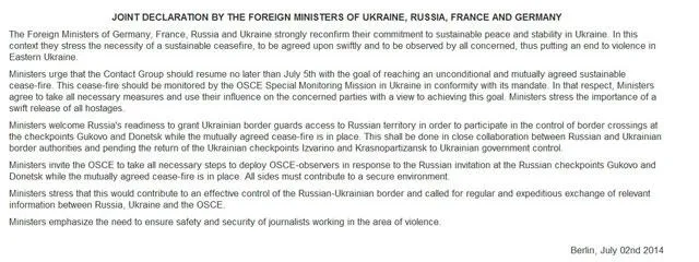 - готовности министров иностранных дел Украины, Германии, России и Франции принимать необходимые меры и использовать свое влияние на заинтересованные стороны с целью достижения условий перемирия;