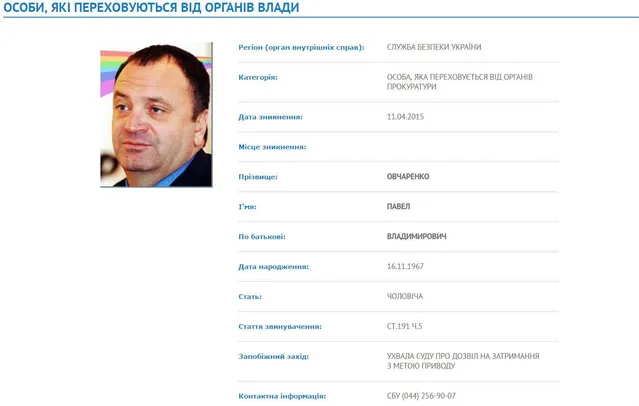 Объявление о розыске Овчаренко размещено в разделе "Лица, которые скрываются от органов власти" на сайте МВД.