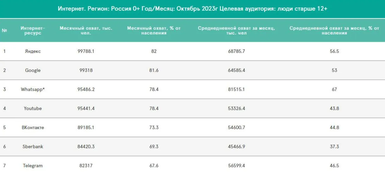 Если сравнить рейтинг "Интернет-ресурсы" по рейтингу охвата аудитории в России с использованием данных Mediascope, окажется, что в октябре 2023 года поисковик Google Search занимал второе место с охватом 99,3 миллиона человек в месяц, а сервис YouTube – четвертое с 95,4 миллиона человек в месяц.