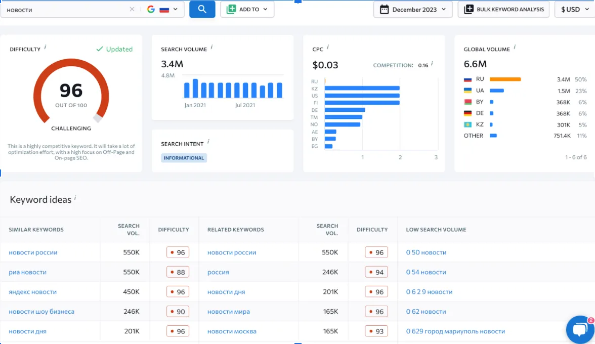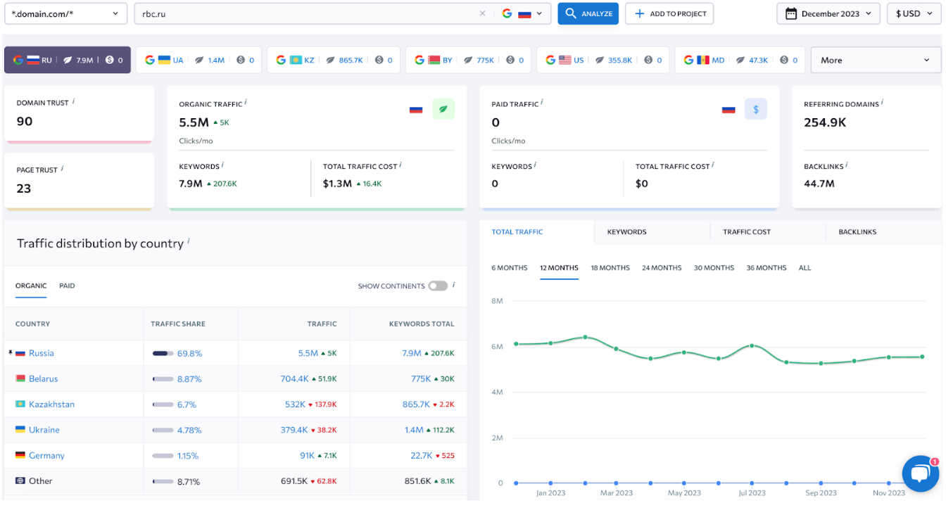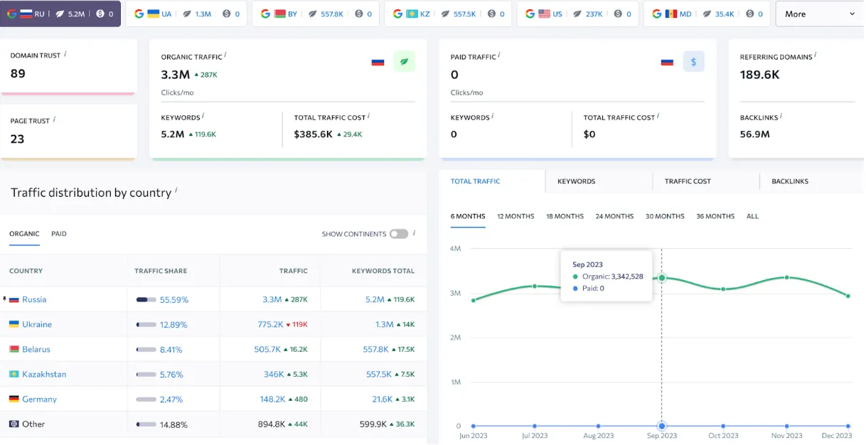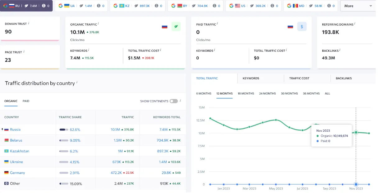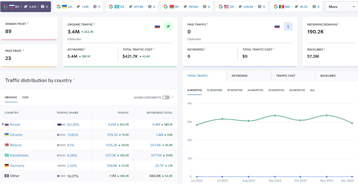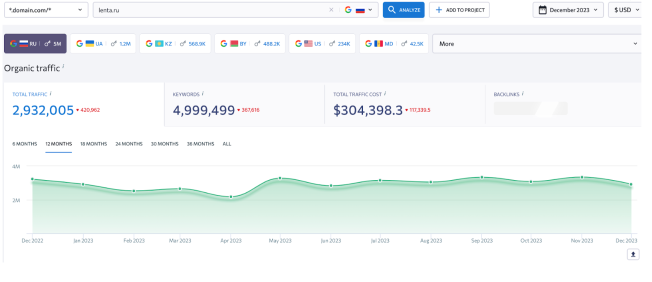 При этом, как видно на графике с платформы Seranking, поисковый трафик с Google на сайт "Lenta.ru" – стабилен в течение 2023 года, и не только на территории России, а также в Украине, и даже в Германии и других странах Европы, где проживают русскоязычные пользователи сети.