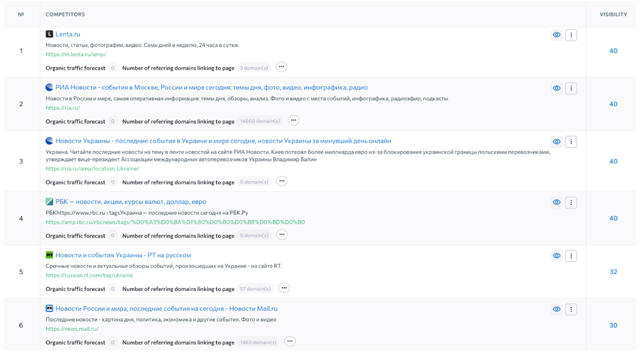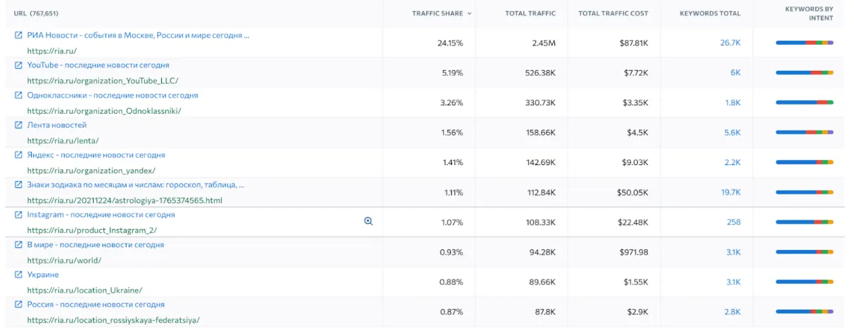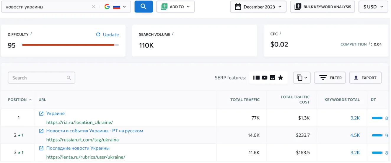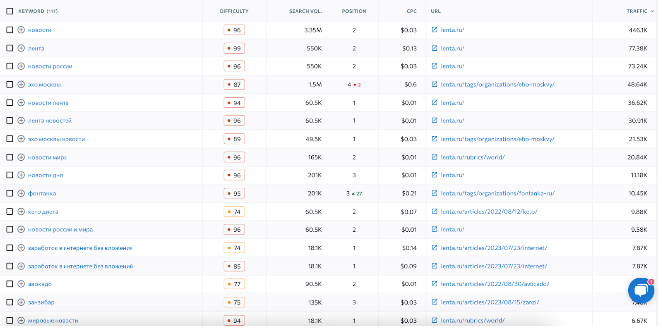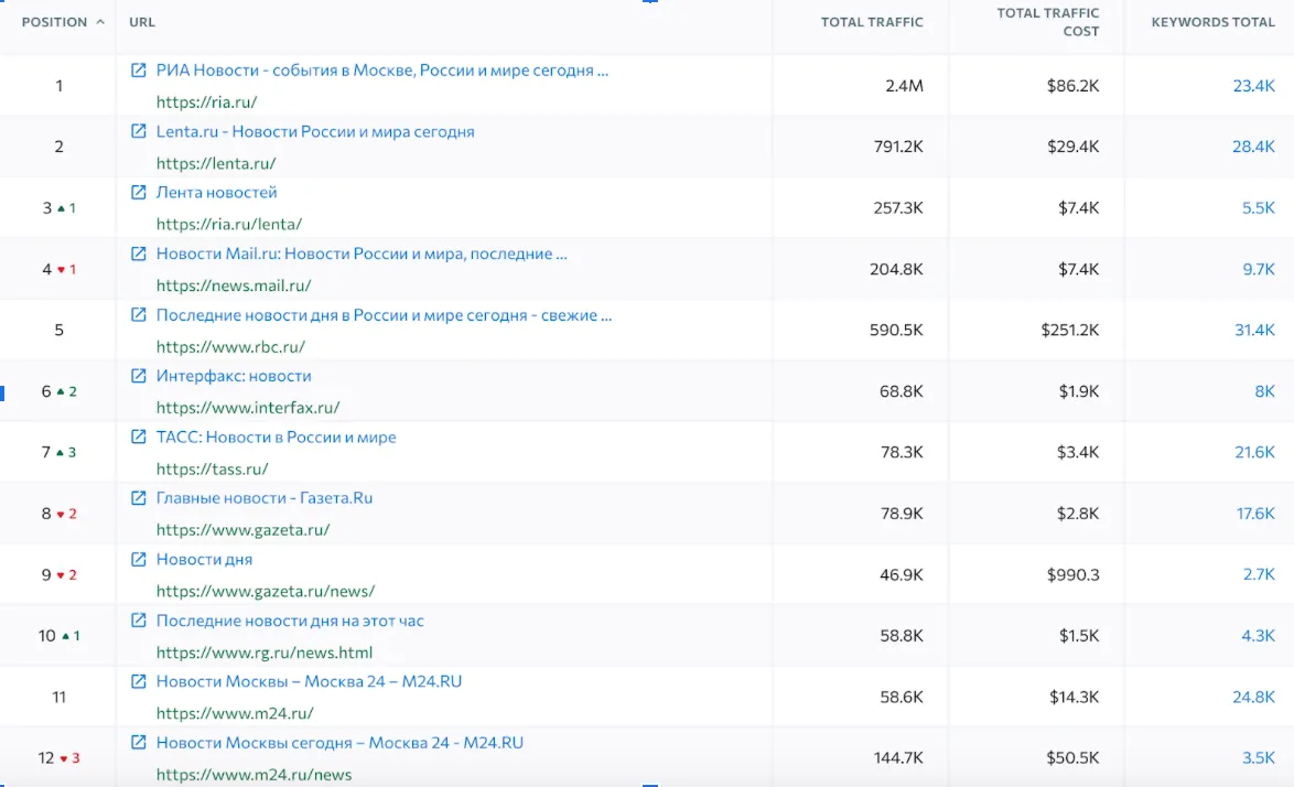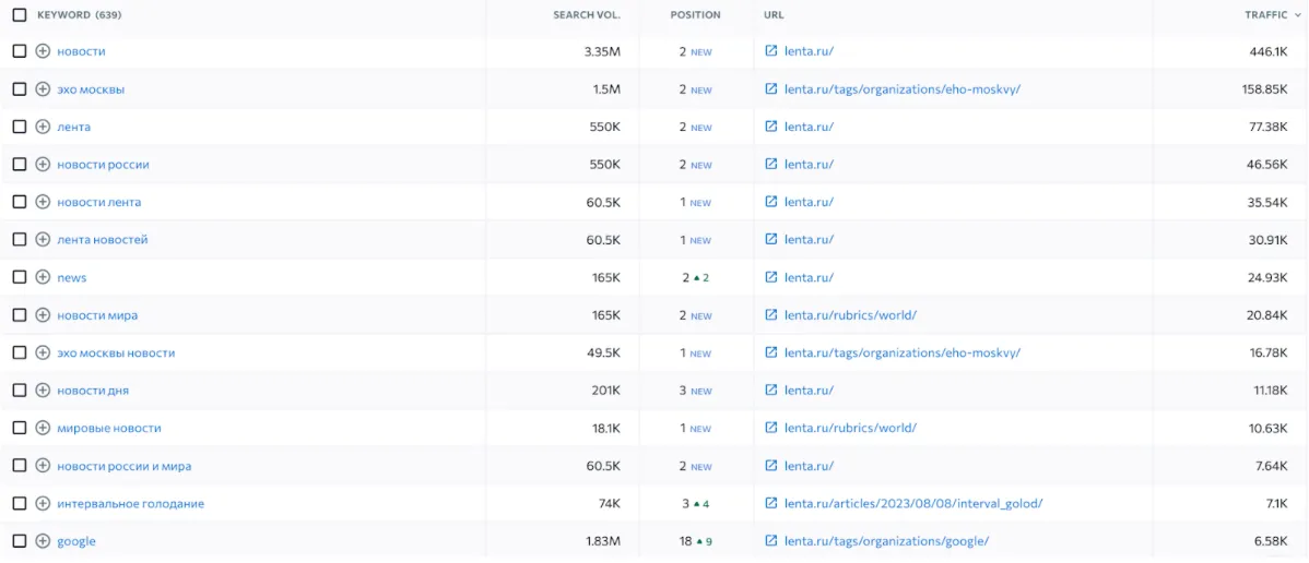По данным аналитической платформы Seranking, сайт "Lenta.ru" только за месяц получает 3 миллиона переходов из Google в России и еще 1,2 миллиона в Украине. При этом львиная доля этих переходов из Google на пропагандистский сайт происходит именно по поискам новостей – "новости", "новости россии", "лента новостей". Ведь сайт "Lenta.ru" занимает в поисковой выдаче Google места в топ-3 по этим запросам.