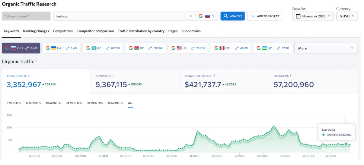 Рассмотрим это с точки зрения поисковой аналитики. Так, согласно данным платформы Seranking, пропагандистское издание "Lenta.ru" получило 3,5 миллиона переходов пользователей с Google только за ноябрь 2023 года.