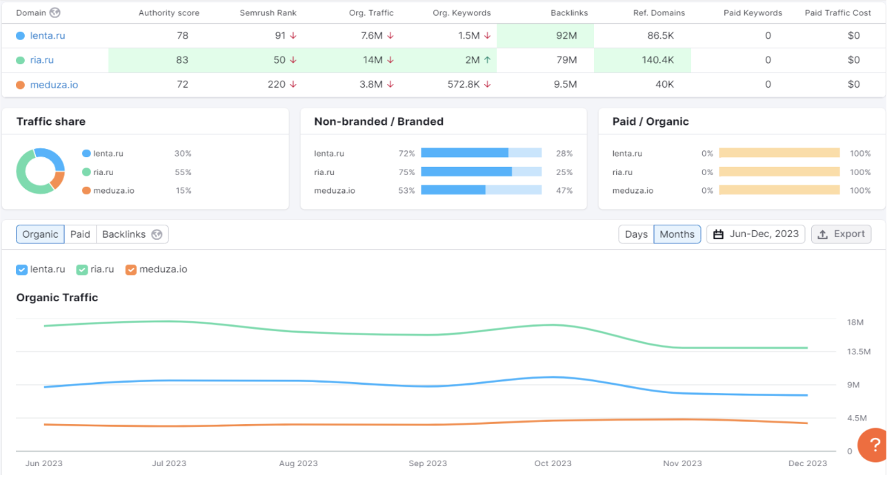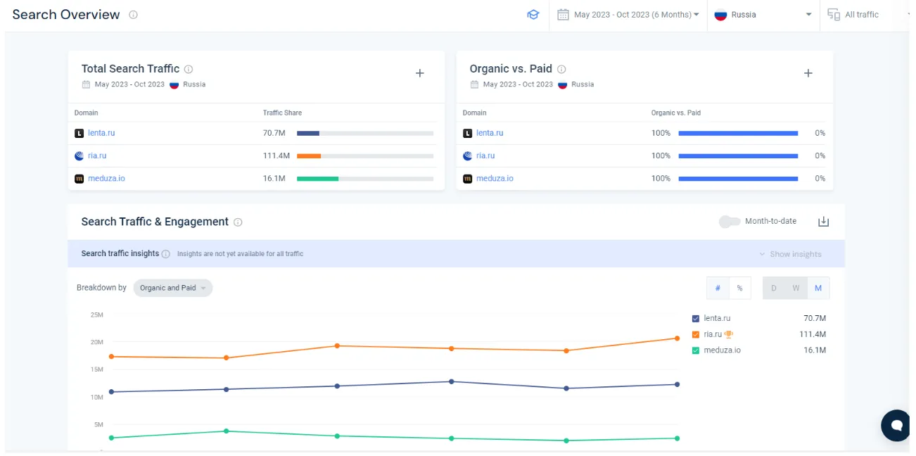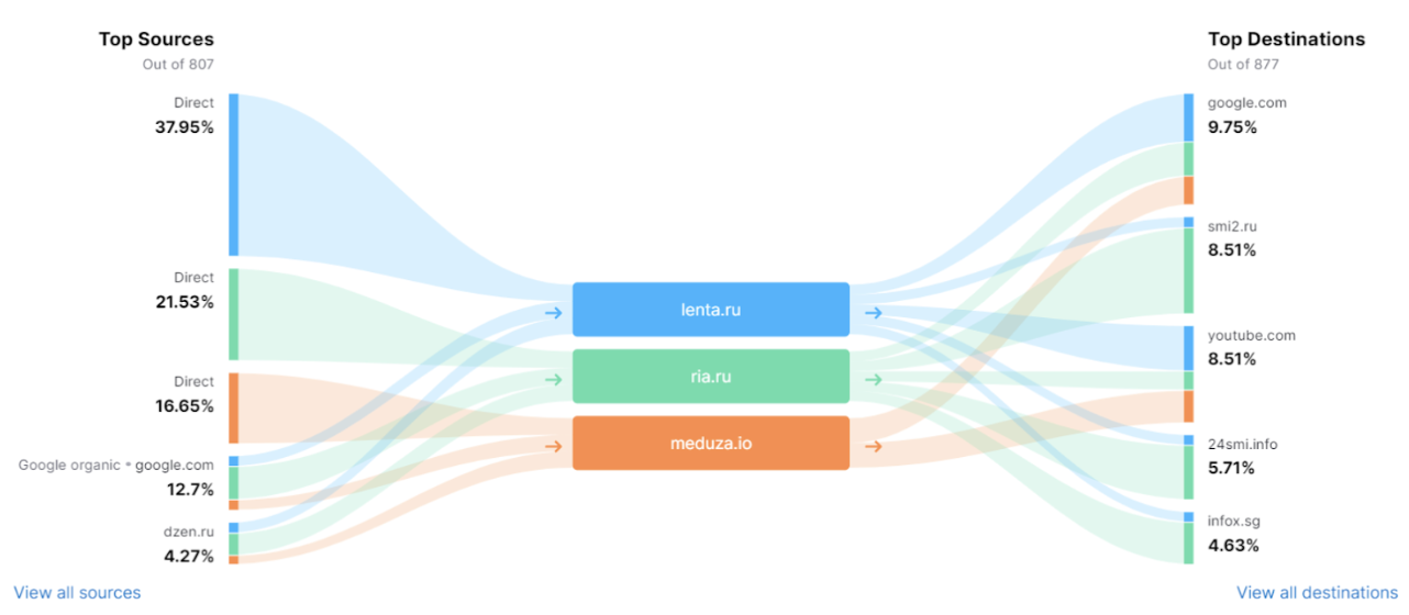 Если сравнить поисковый трафик прокремлевских сайтов "РИА Новости" и "Lenta.ru" с условно оппозиционной "Медузой", по данным платформы SemRush, то увидим, что "Медуза" имеет в 3,5 раза больше трафика, чем "РИА Новости". Если же принять во внимание все российские пропагандистские сайты вместе, то доля трафика из поиска на ресурсы, которые предоставляют более или менее объективную информацию как на российские реалии, будет мизерной. Констатируем также, что "Lenta.ru" и "РИА Новости" получают весомую долю посещений сайта именно от Google.