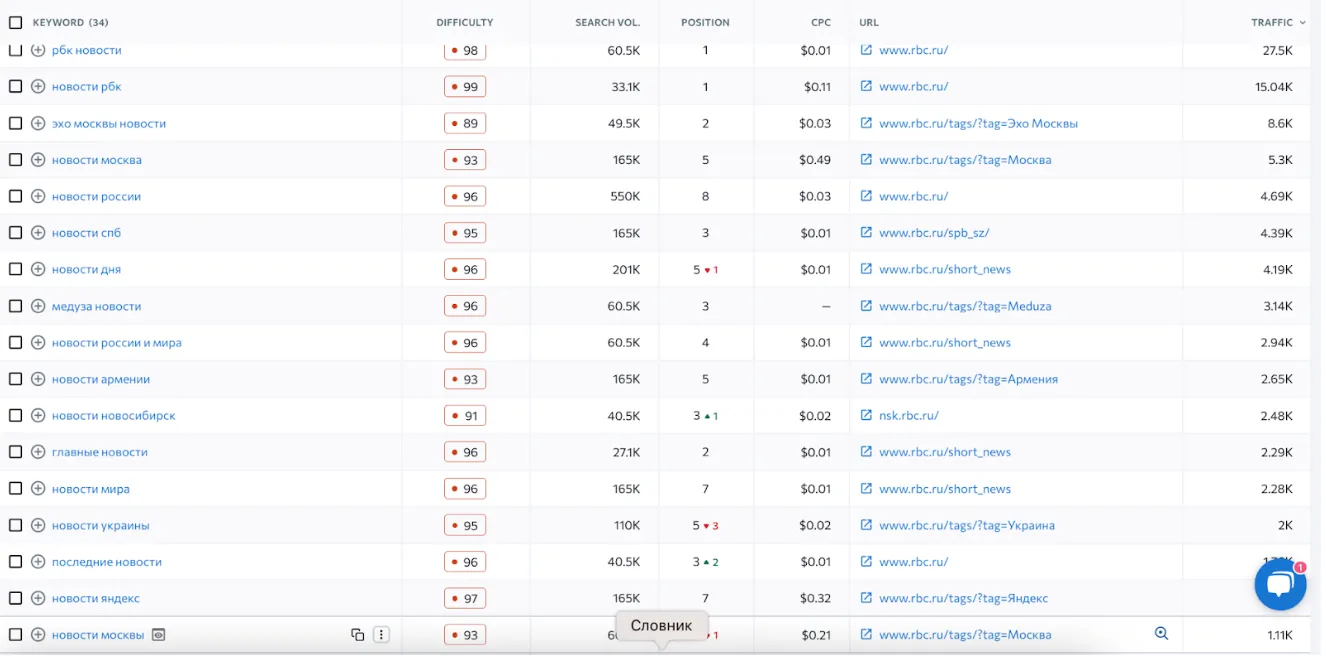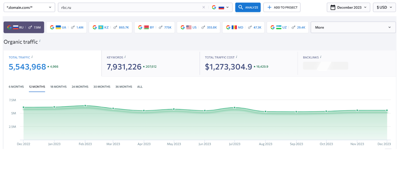 Сайт "РБК" получает 5,5 миллиона переходов с поиска в Google в России и еще почти полтора миллиона в Украине.