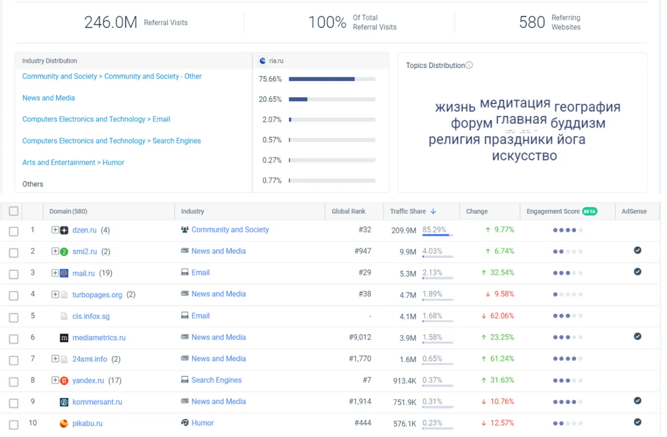 Например, другие российские сайты, такие как "yandex.ru" и "dzen.ru" вообще работают исключительно в интересах тоталитарного режима. Например, "Дзен" за полгода (май – октябрь), согласно данным платформы SimilarWeb, стал главным источником реферального трафика для сайтов "РИА Новости" и "Lenta.ru". Так, первый сайт получил 209,9 миллиона обращений, что составило 85,3% всего его реферального трафика.