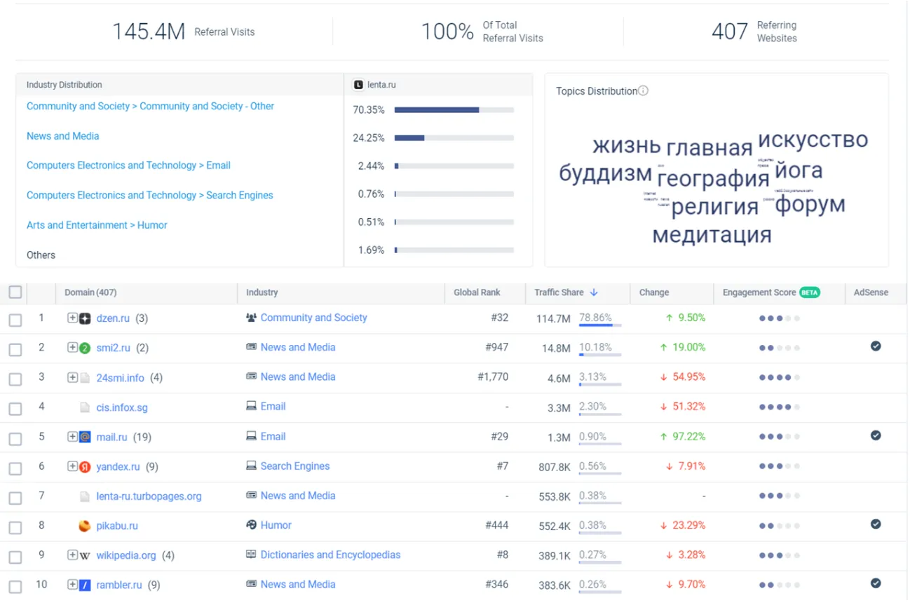 В то время как сайт "Lenta.ru" получил из "Дзена" 114,7 миллиона таких переходов на сайт, что составило 78,9% всего его реферального трафика.