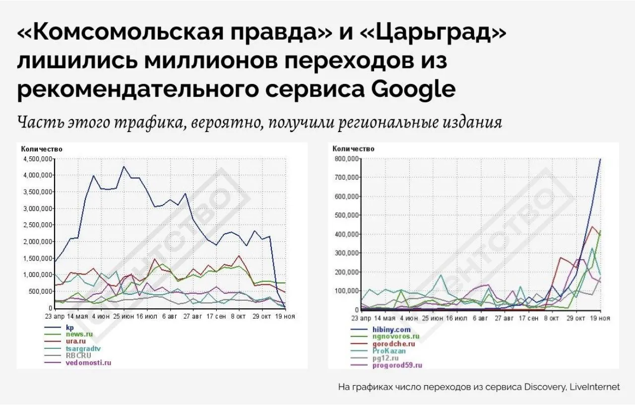 Все-таки в Google решили ответить обидчикам. Журналисты "Агентство" проанализировали данные сервиса LiveInternet и выяснили, что "Комсомольская правда" и "Царьград" недавно потеряли миллионные переходы от рекомендательной системы Google Discover. Число переходов на сайт "КП" с прежних недельных 15 миллионов упало до 72 тысяч. У "Царьграда" с Discover из прежних 2,2 миллиона осталось только 13,7 тысячи переходов за неделю.