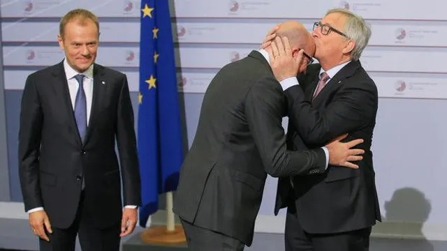 Во время встречи в Брюсселе президент Европейской комиссии Жан-Клод Юнкер расцеловал тогдашнего премьер-министра Украины Арсения Яценюка на глазах фоторепортеров.