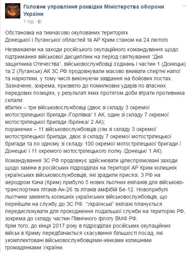 В разведке отметили, что из России на аэродром Кача прибыли 5 новых летных экипажей для военно-транспортных самолетов Ан-26 и самолетов амфибий Бе-12. Новоприбывшие летчики заменят бывших украинских военнослужащих, которые перешли на службу в Россию.