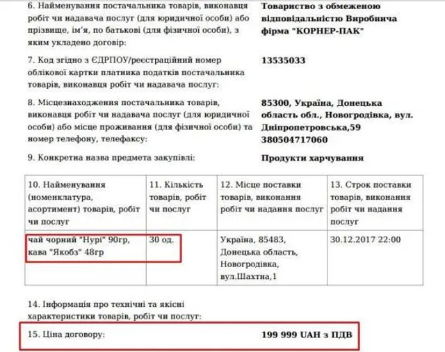 Поставщиком является фирма "Корнер-ПАК", зарегистрированная в Покровске. Руководитель — Людмила Пальчик, которая проживает в Киеве.
