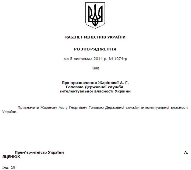 Справка: Алла Жаринова до этого времени работала директором Государственного предприятия "Украинский институт промышленной собственности". Кандидат экономических наук.