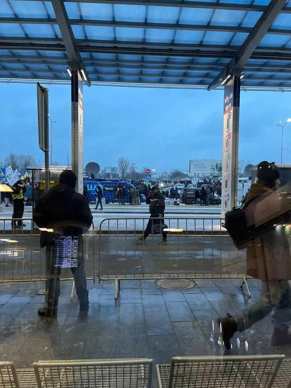Вблизи терминала "А", где ожидается возвращение Порошенко, собралось около 200 его сторонников. В то же время все обочины заставлены машинами и микроавтобусами с ровненскими, киевскими, харьковскими, донецкими и другими номерами.