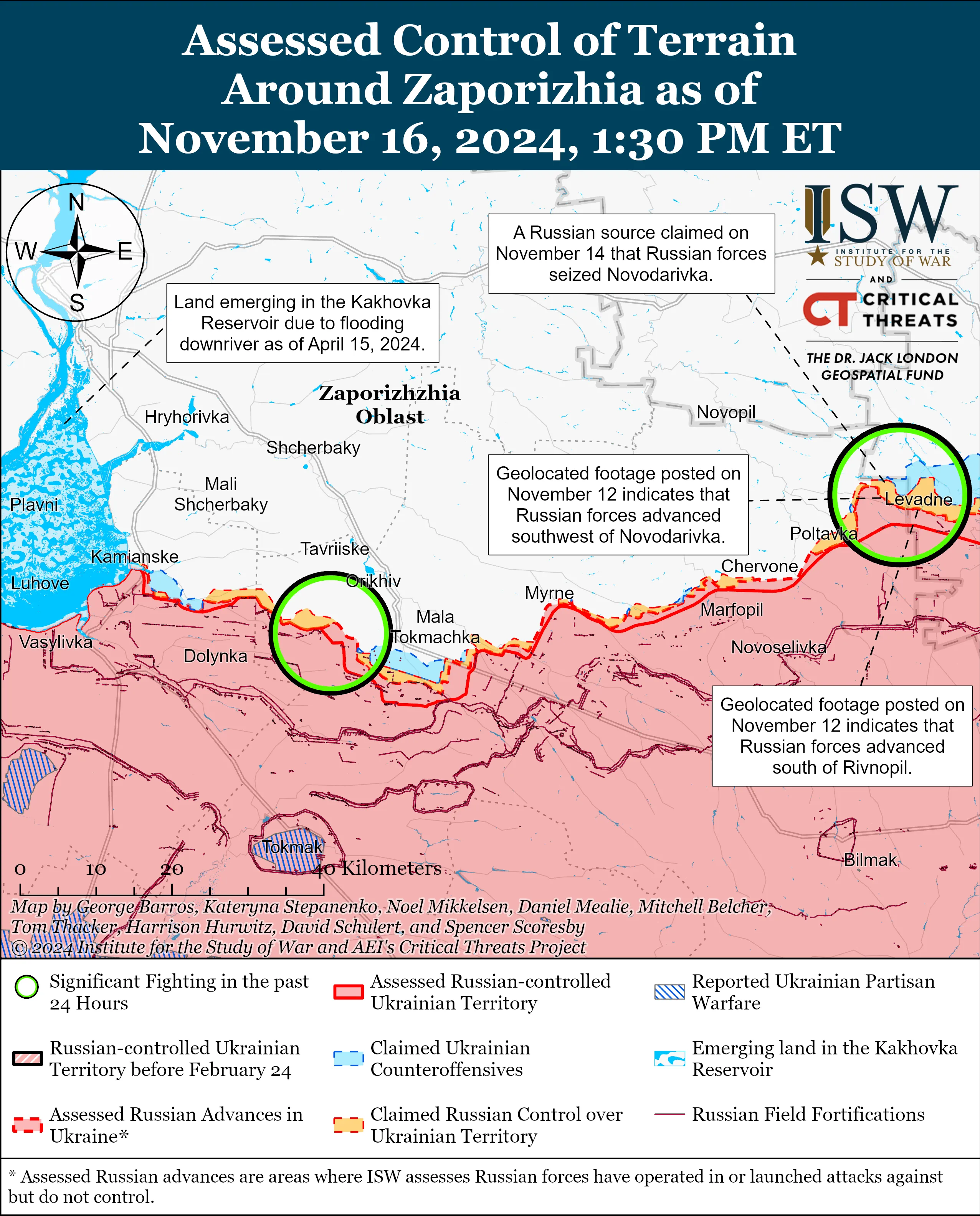 В районе Работино российские войска пытались продвинуться в направлении Новоандреевки, но успехов не достигли. 15 и 16 ноября российские источники заявляли о незначительном прогрессе возле Новоданиловки, но подтверждений этому ISW не нашли.