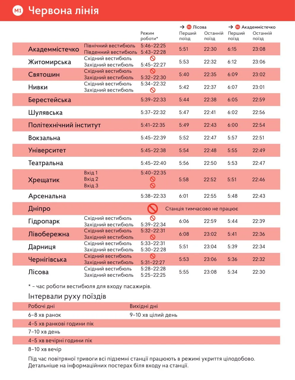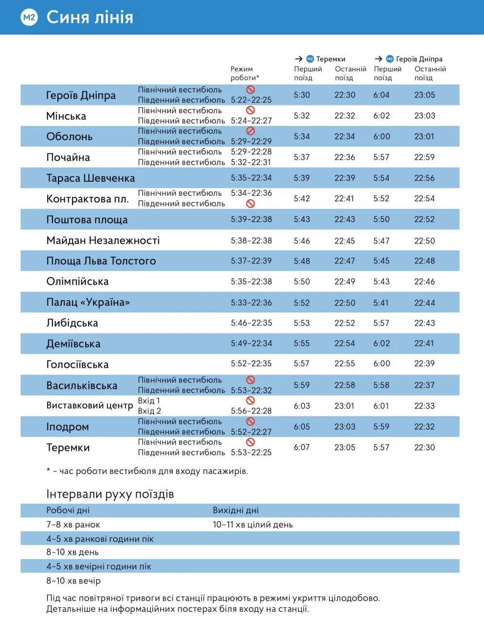 - Синяя линия. Быстрее всего заработает станция Героев Днепра – 05:22 на Южном вестибюле. Там же будет позднее последний поезд, в 23:05.