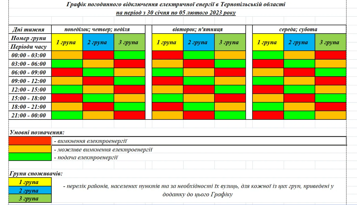График почасового отключения электрической энергии в Тернопольской области на период с 30 января по 5 февраля: