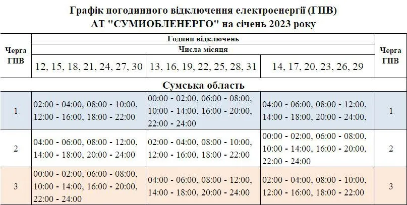 С 13 января по городу Сумы и области вводится график почасовых отключений: