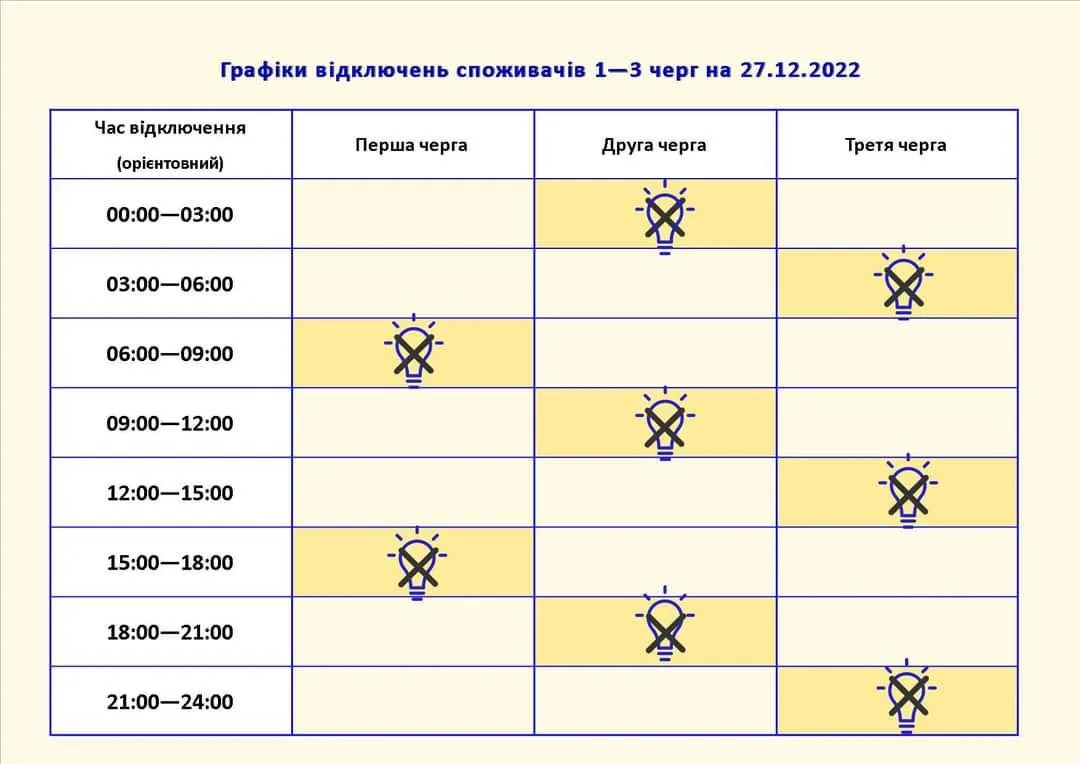 Облэнерго обнародовало график почасовых обесточиваний на 27 декабря: