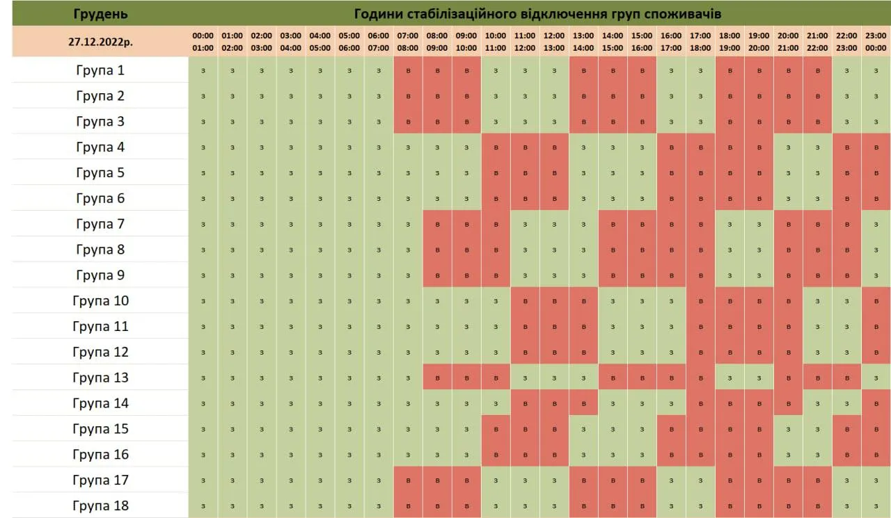 "Черновцыоблэнерго" обнародовали график отключений на 27 декабря. Найти свою группу можно по ссылке.