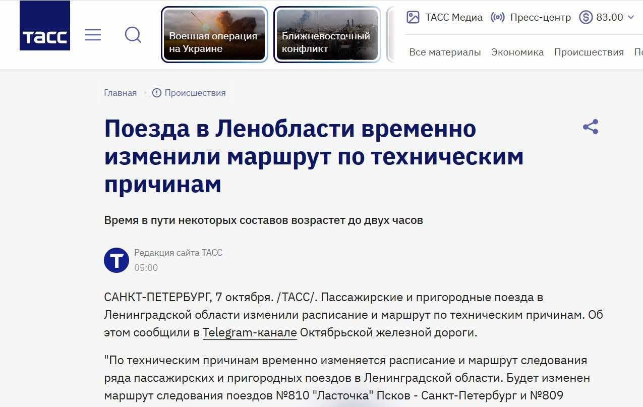По данным источников, утром во вторник, 7 октября, в Ленинградской области на железнодорожном перегоне "Строганово – Мшинская" произошел подрыв путей с последующим схождением локомотива и вагонов поезда, перевозившего военный груз.