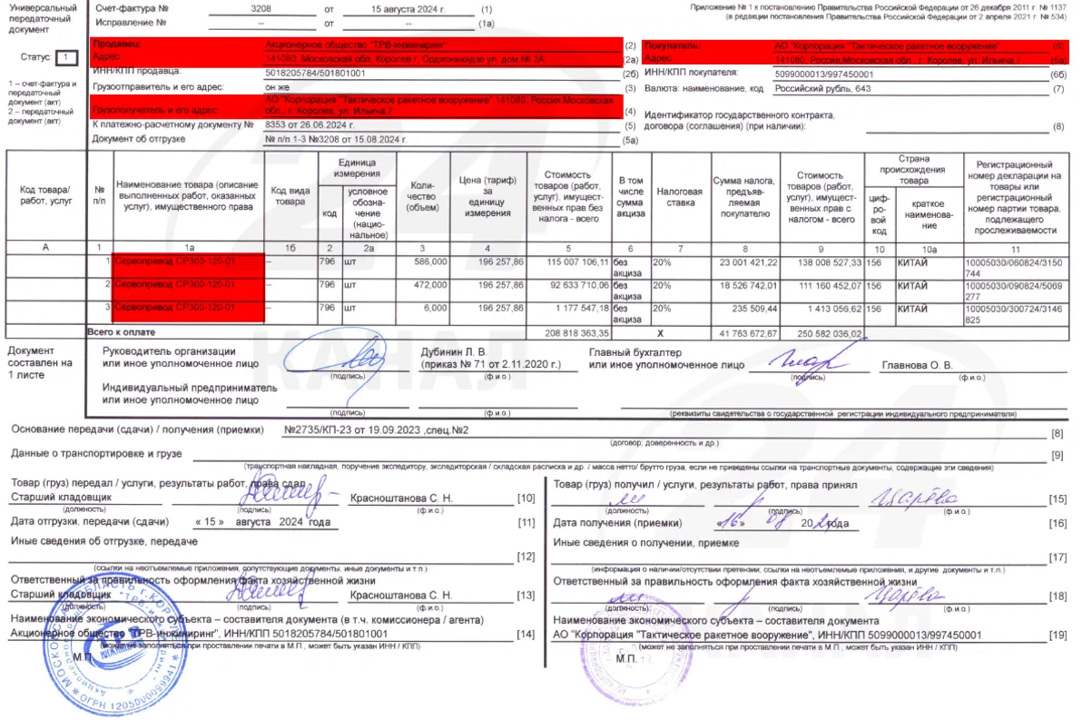 Однако есть и такие, что запланированы на два года вперед. Например, счет №1811 от 29 августа 2024 свидетельствует, что УПКБ "Деталь" получит комплект для своего заказа для изготовления 50 альтиметров в конце февраля – начале марта 2026 года.