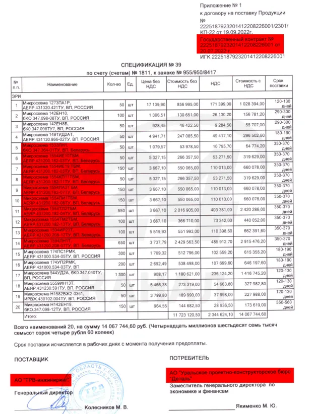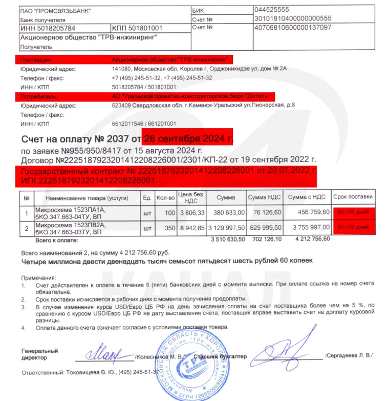 Смотрите фото документов о закупках "ТРВ-инжениринг" для УПКБ "Деталь" / Фото предоставлены частной разведывательной компанией "Даллас":
