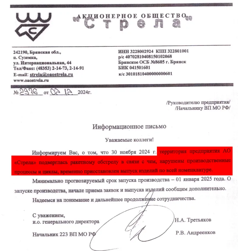 Например, это может быть прилет украинских беспилотников или ракет, который буквально выключил АО "НПО "Стрела" из всех цепей поставок минимум на целый месяц.
