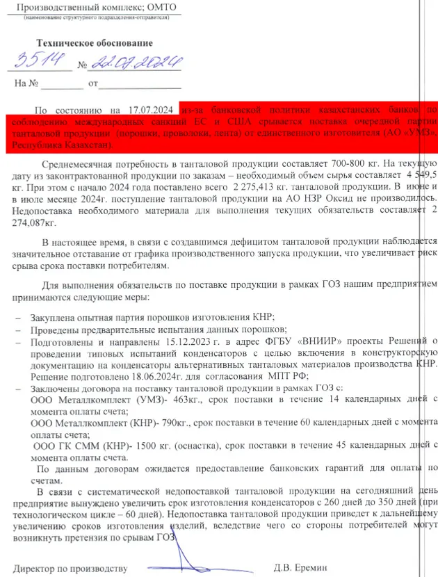 Или же появление проблем с расчетами между "ТРВ-инжениринг" и казахстанскими поставщиками танталовой продукции (из которой изготавливают конденсаторы), из-за чего россиянам пришлось экстренно искать компоненты китайского производства.