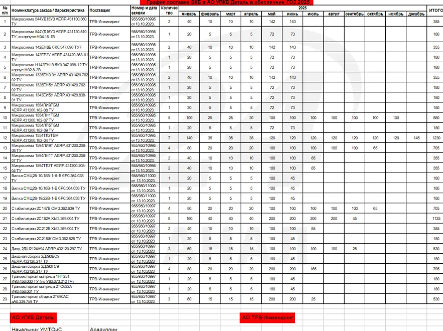 График поставок электронной комплектующей базы на УПКБ "Деталь" согласно заказам за октябрь 2023 года на 2025 год / Фото предоставлено частной разведывательной компанией "Даллас"