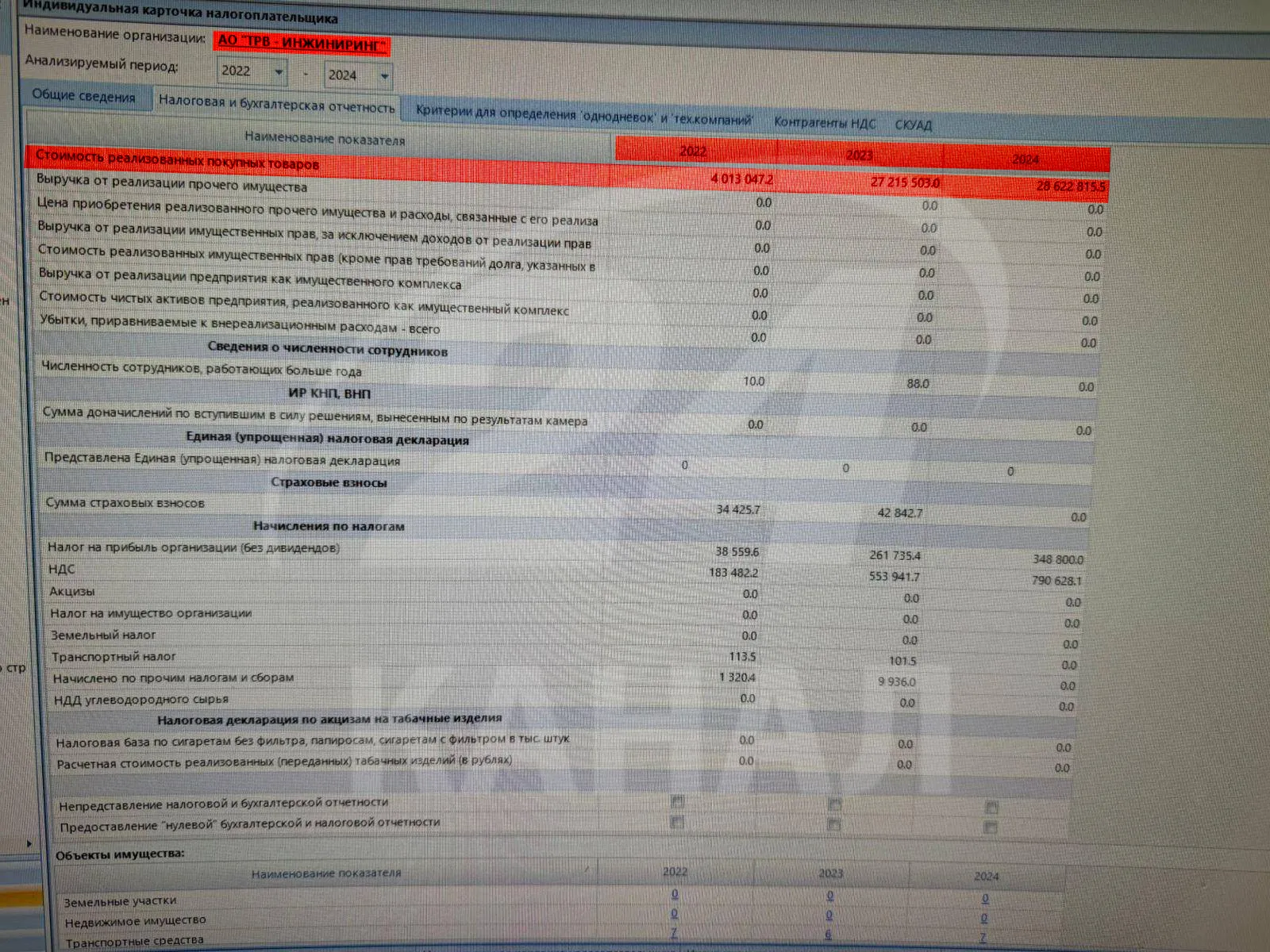 Чтобы понять роль этой компании в войне против Украины, достаточно взглянуть в закрытые данные по финансовой отчетности "ТРВ-инжениринг". Так, стоимость реализованных товаров за 2022 и 2023 годы выросла почти в 7 раз.