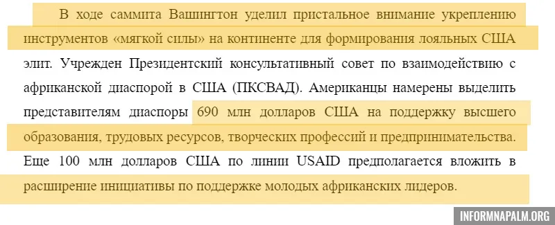 При подготовке российские дипломаты для своего руководства справки о втором саммите "США – Африка", который проходил 13–15 декабря 2022 года в Вашингтоне. Этот документ интересен, поскольку демонстрирует, что США инвестируют средства в образование, медицину, кибербезопасность, энергонезависимость и другие жизненно важные сферы развития африканских стран.