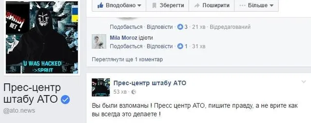 Как заявил спикер пресс-центра штаба АТО Иван Арефьев в эфире одного из украинских телеканалов, сейчас группа специалистов пытается восстановить контроль над страницей.