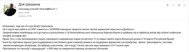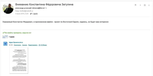 Стоит отметить, что среди полученных файлов с компьютера Усовского есть документ под названием "Проект: Украина – ЕС". Судя по содержанию письма, один из авторов документа – Иван Иванович Скориков, он же помощник Константина Затулина.