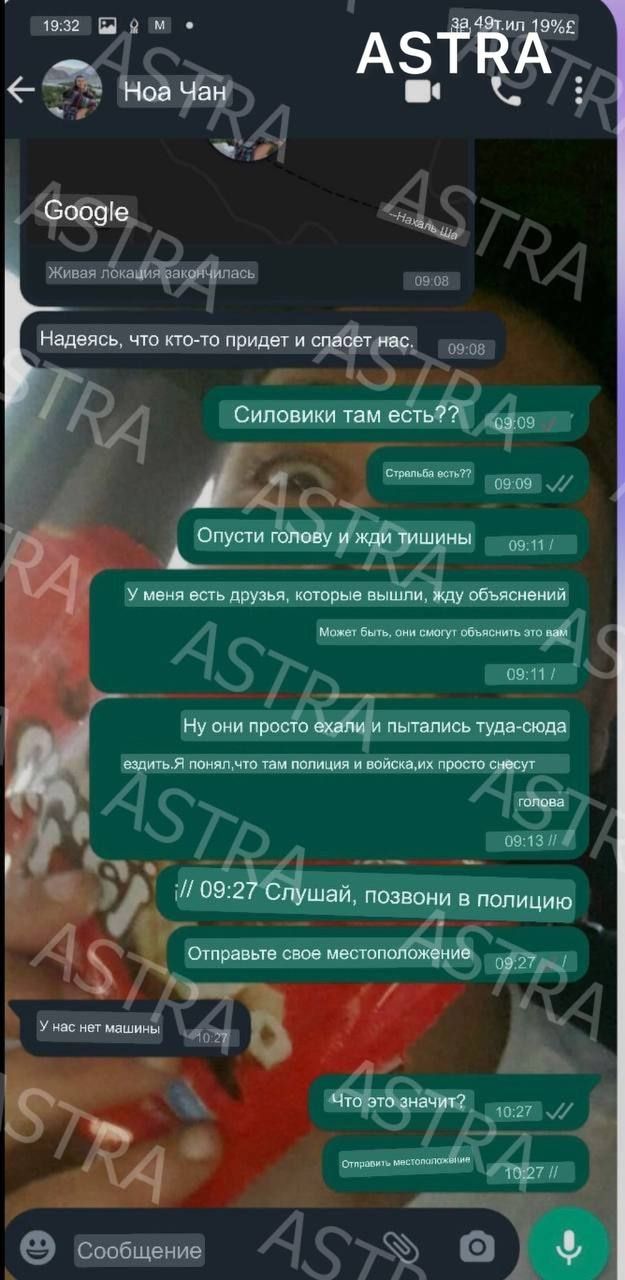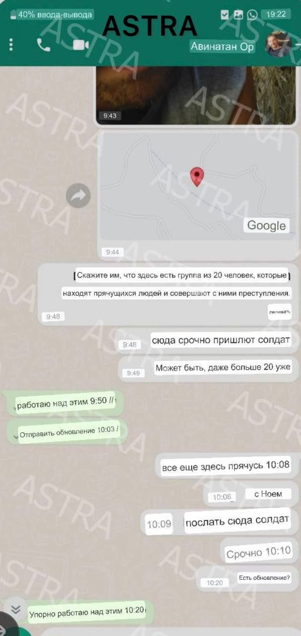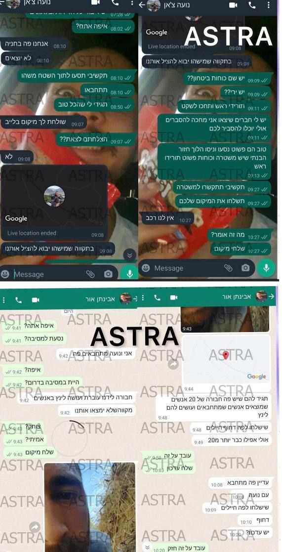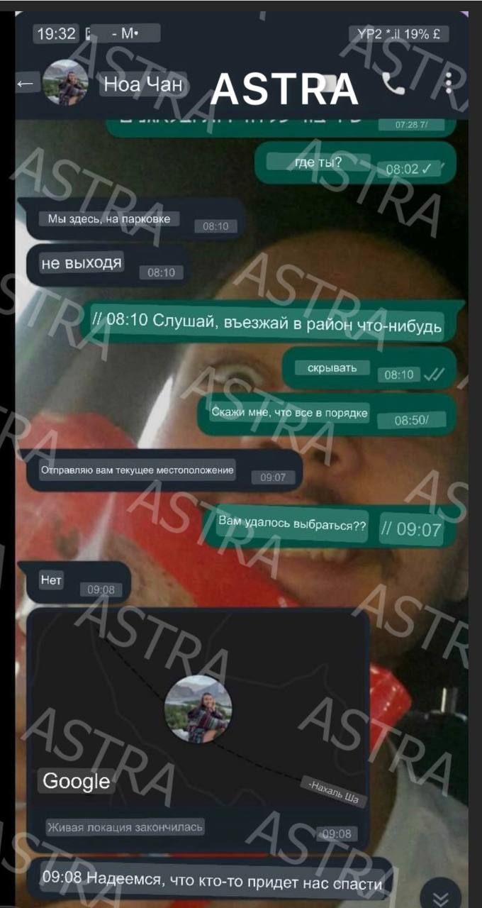 После этого Авитан прислал вторую фотографию и геолокацию. Он попросил друга, чтобы обратился за помощью и на границу с Сектором Газа отправили ЦАХАЛ. Около 10:15 связь с Ноа и Авитаном исчезла.