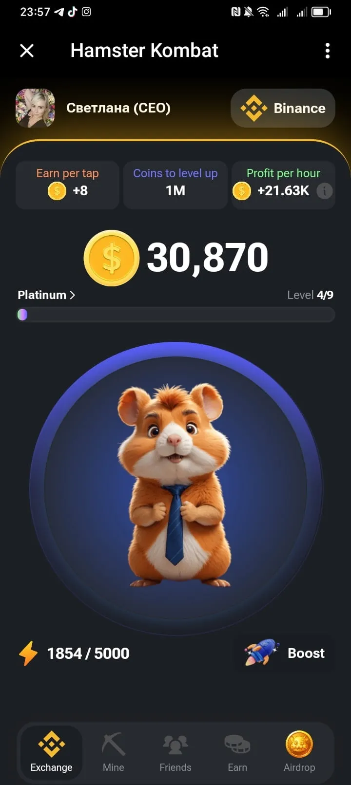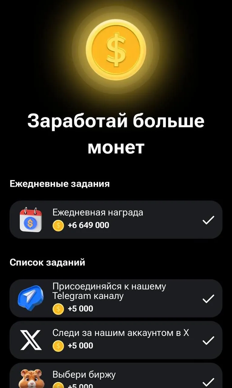 Основная задача игрока – быть руководителем криптобиржи и развивать ее путем увеличения количества монет (токенов), добываемых за определенный промежуток времени. Можно выбрать одну из бирж: Binance, ByBit, OKX, BingX, HTX, Kucoin, Gate, MEXC или Bitget. Самая простая задача – тапать на хомяка.
