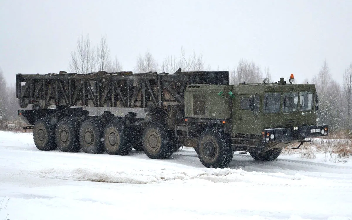 Во-первых, шасси идентифицировано как белорусское МЗКТ-79291 (колесная формула 12×12) производства "Минского завода колесных тягачей". Именно на таких платформах в России базируются ряд грунтовых ракетных систем стратегического и оперативно-тактического назначения. Когда в России пытались создать аналогичное шасси на "КамАЗе" (модель КамАЗ-78509), его грузоподъемность декларировали около 50 тонн; при этом указывали, что это на 10 тонн меньше, чем у белорусского аналога. Следовательно, у МЗКТ-79291 ориентировочную грузоподъемность можно оценить примерно в 60 тонн.