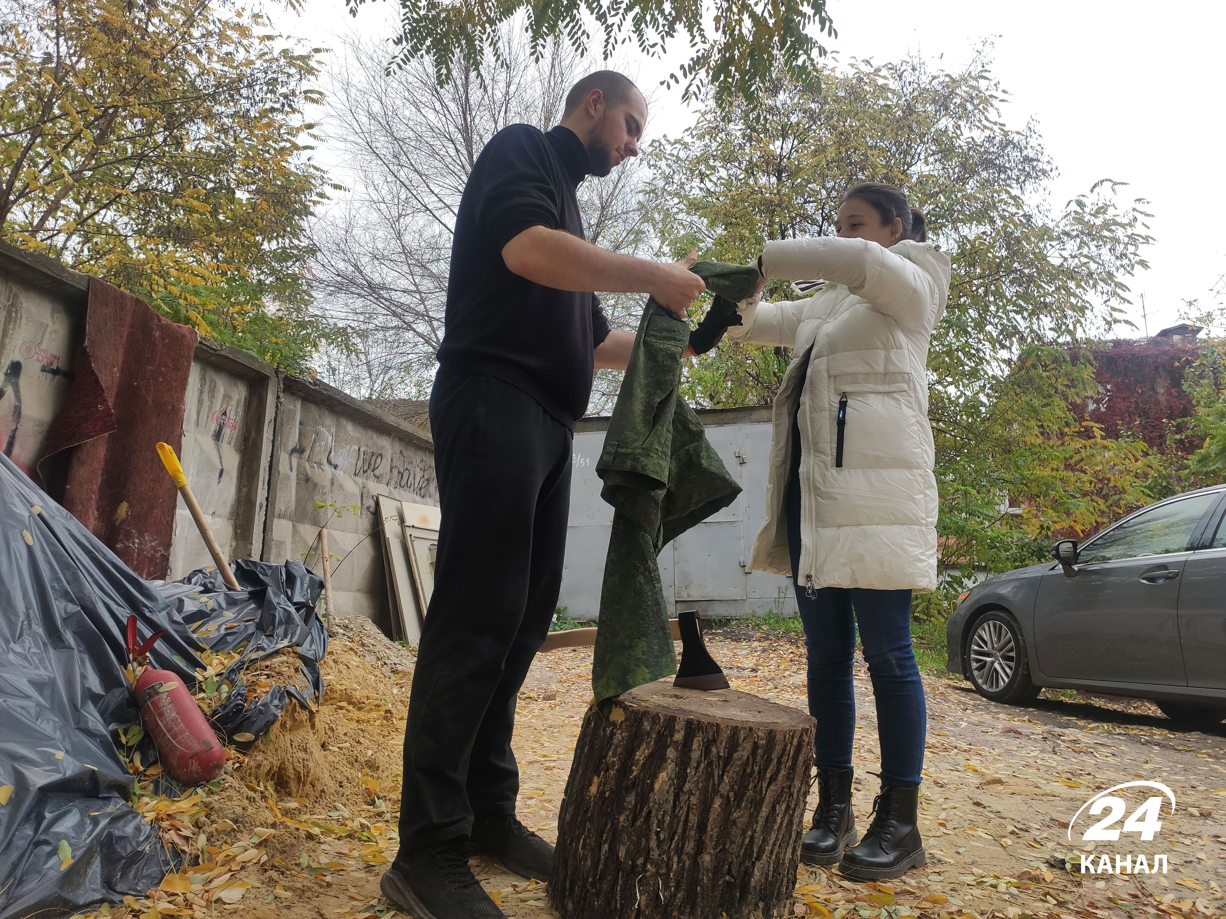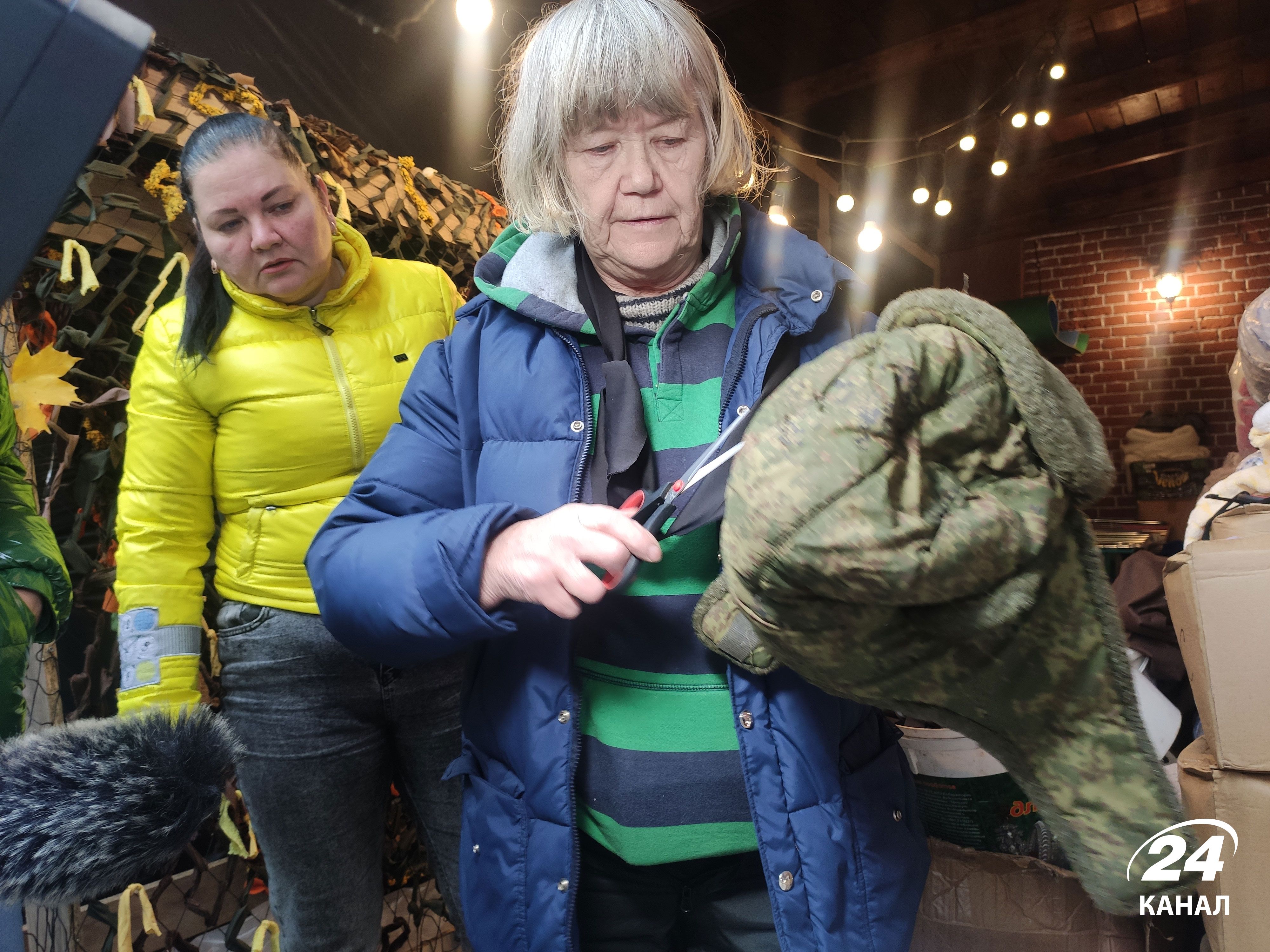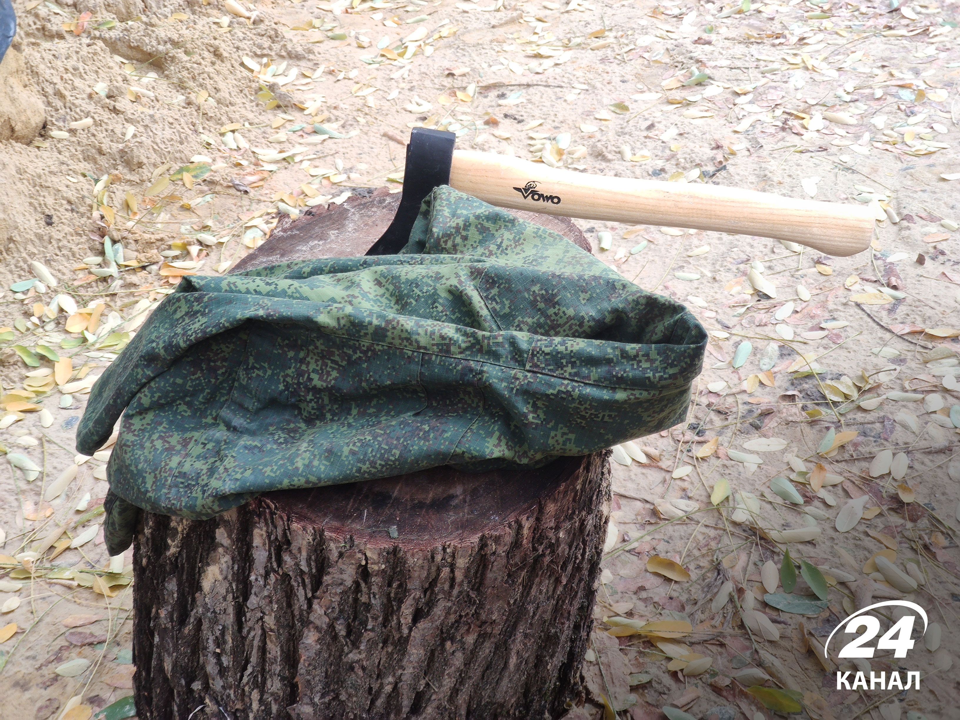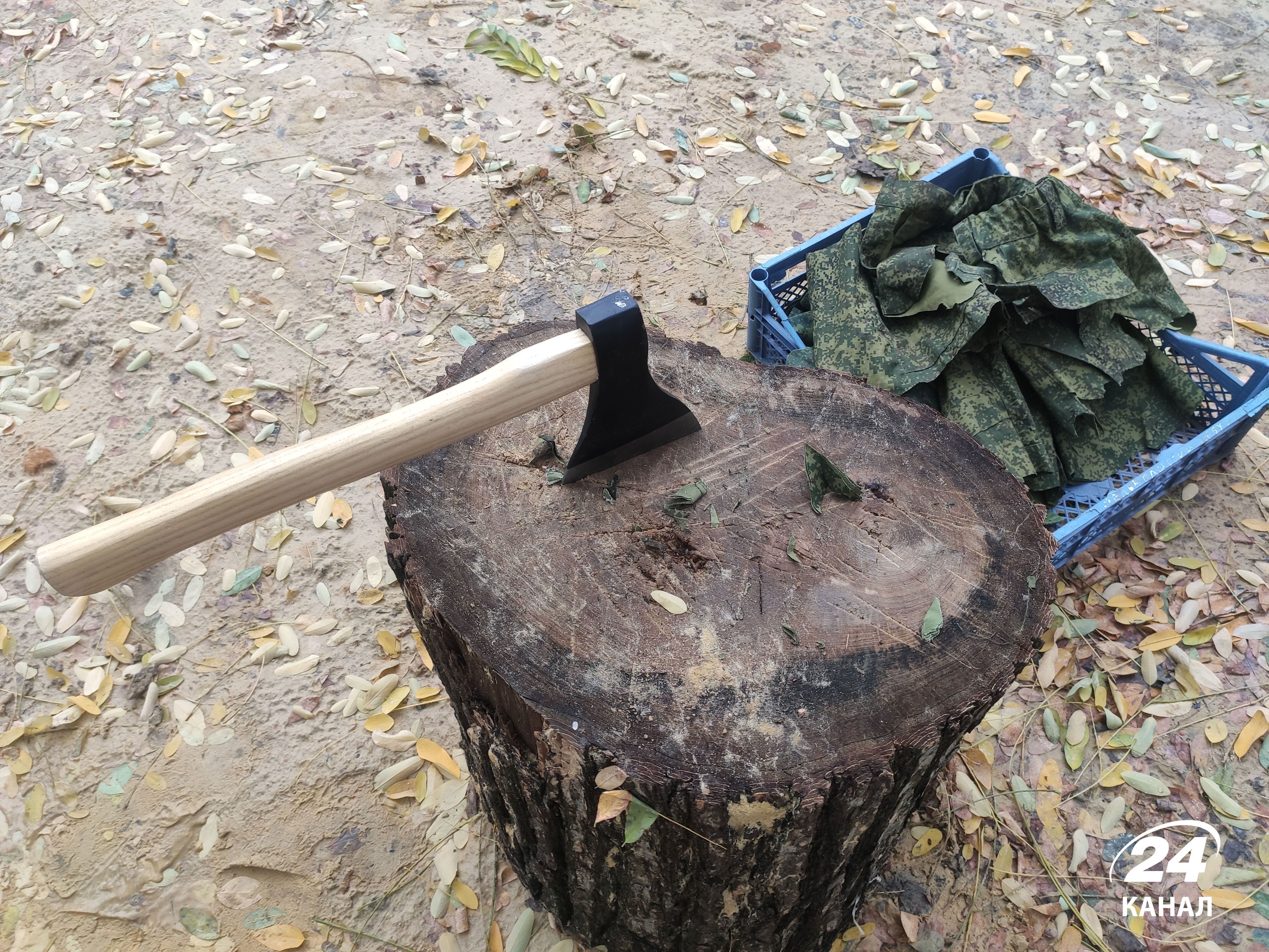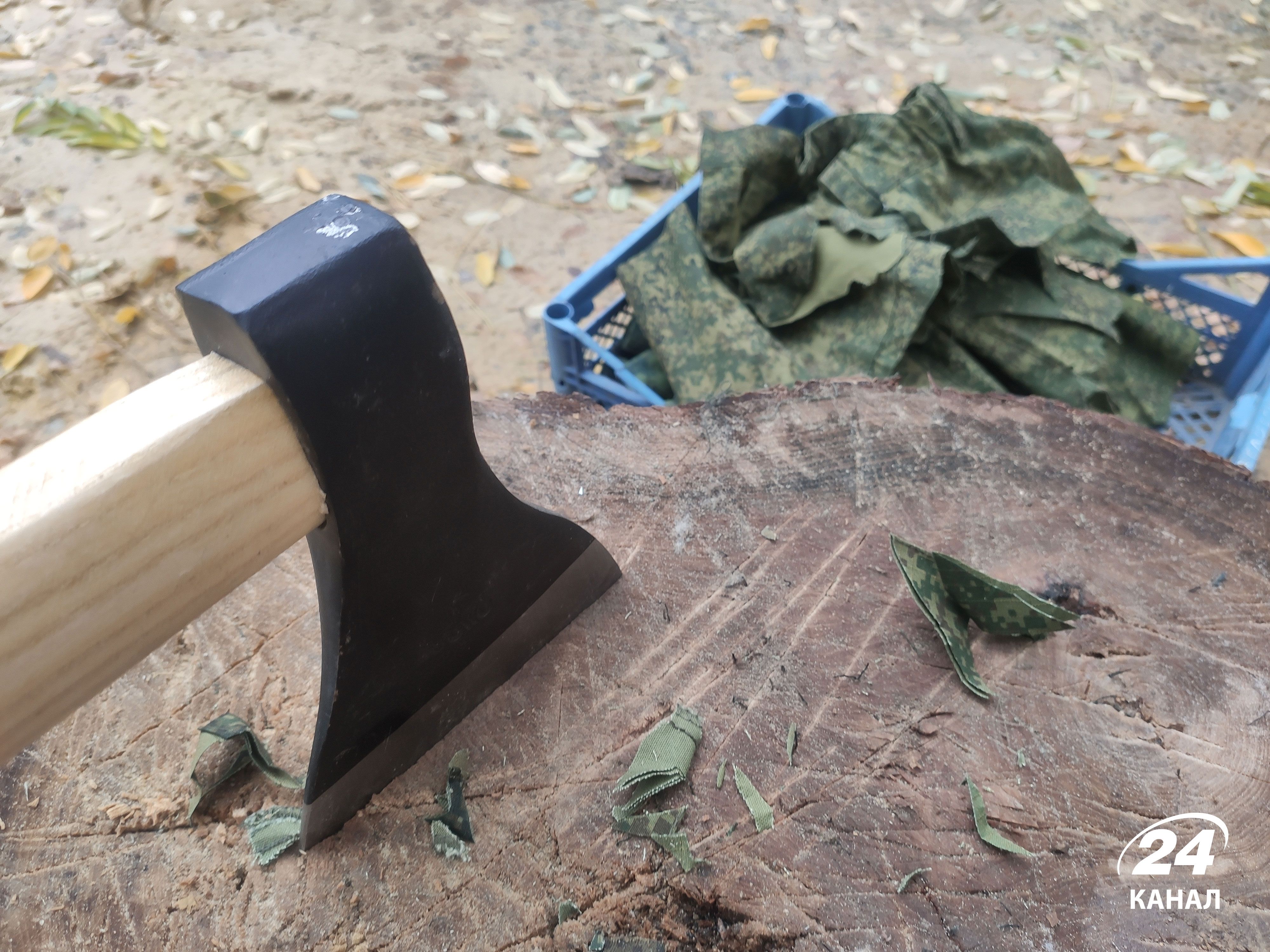 Оказывается, что оккупанты бросают не только драгоценную военную технику, но и форму. Волонтеры отмечают, что сначала топором рубят форму российских военных, после чего и плетут из нее сетки.