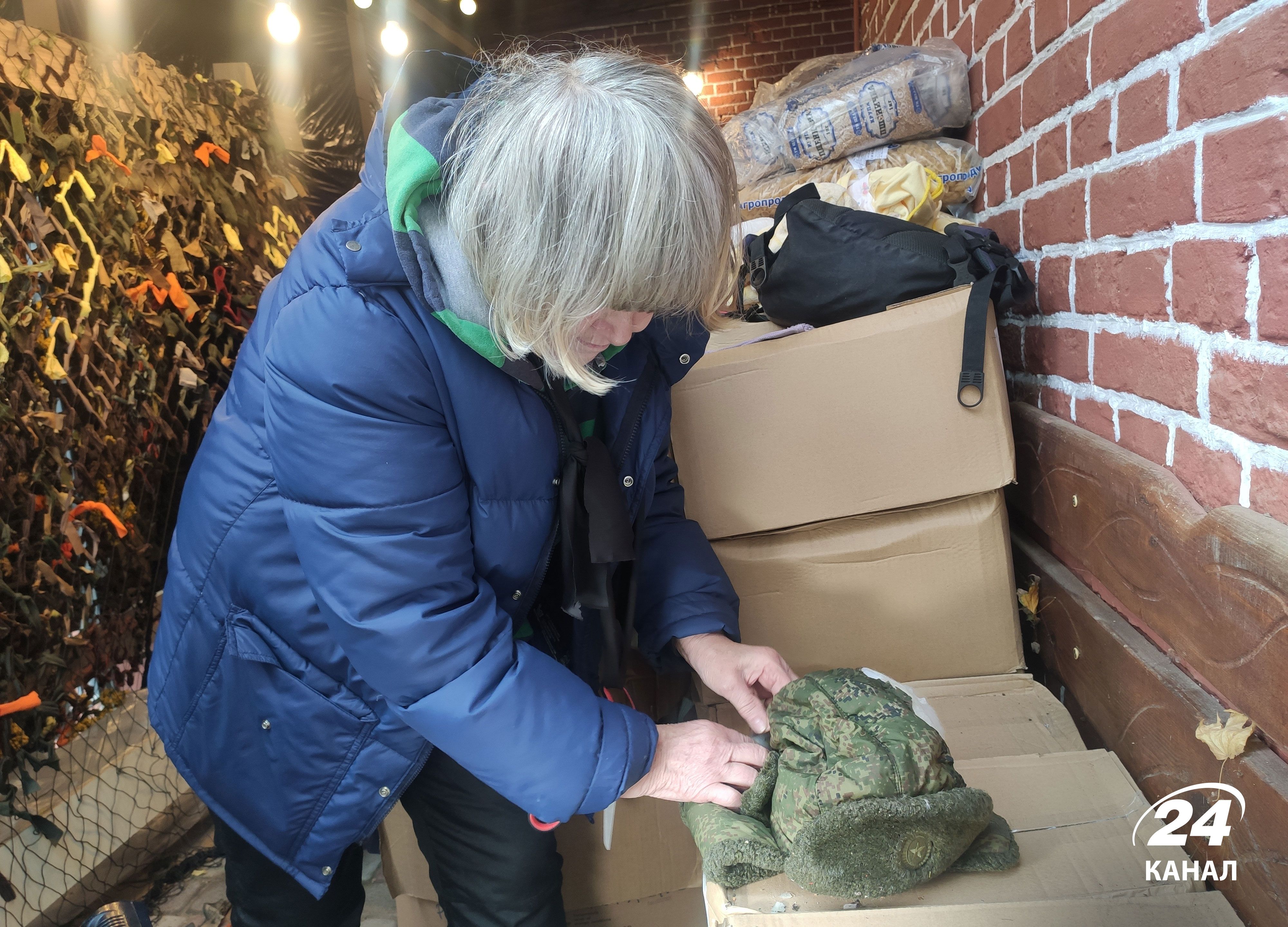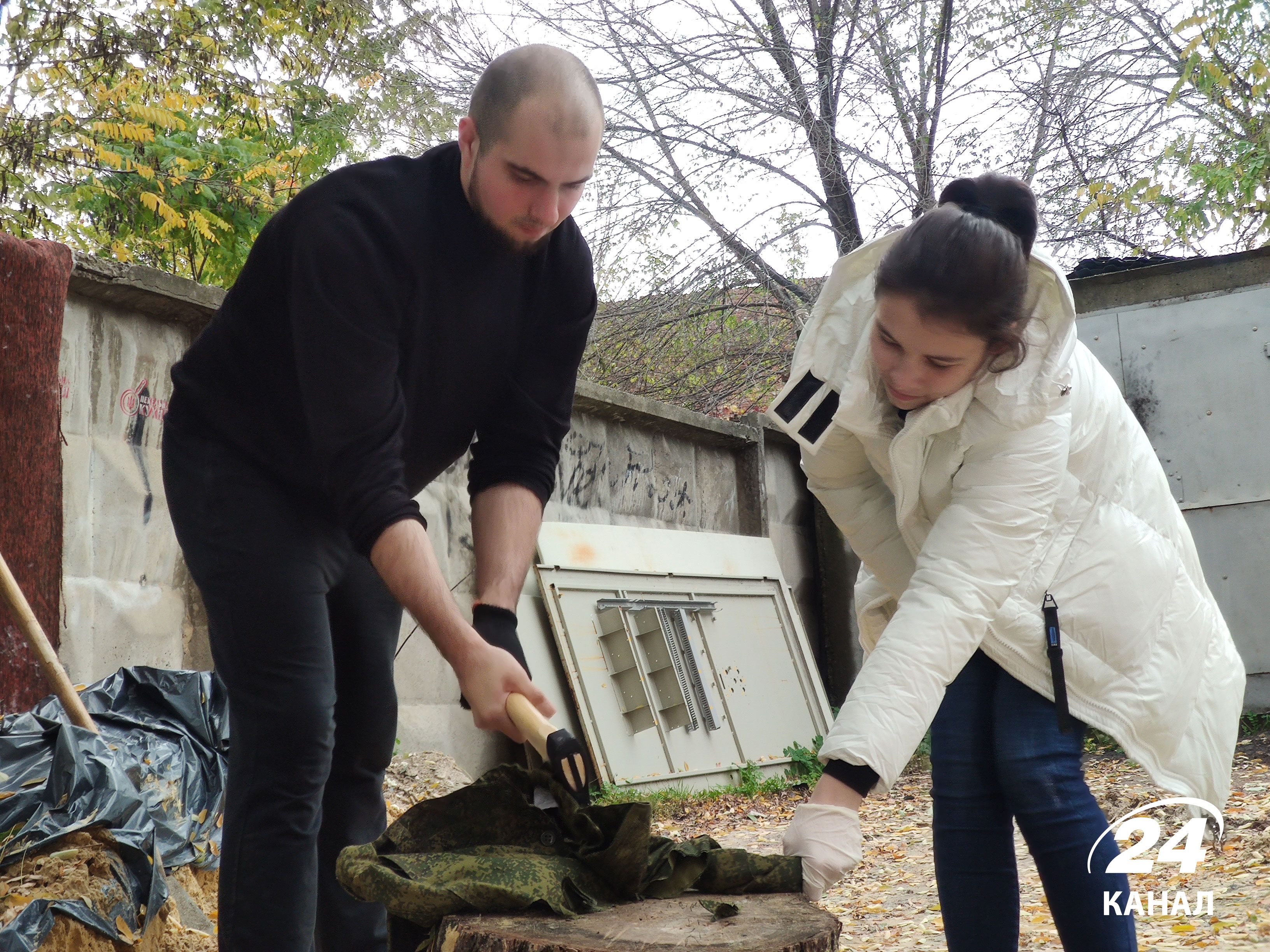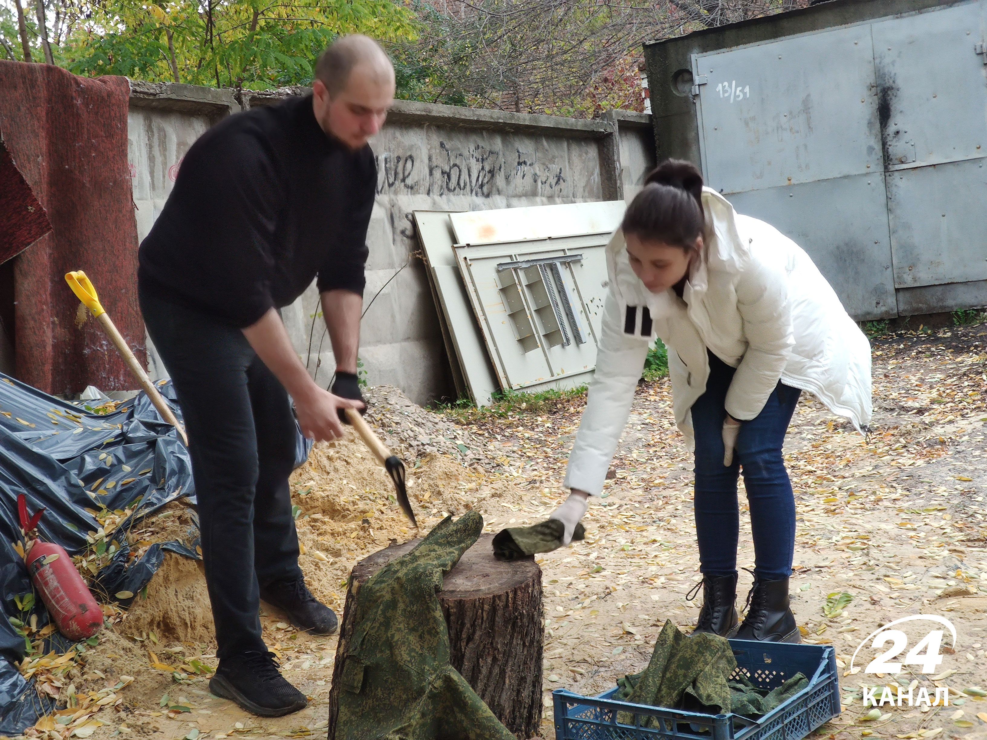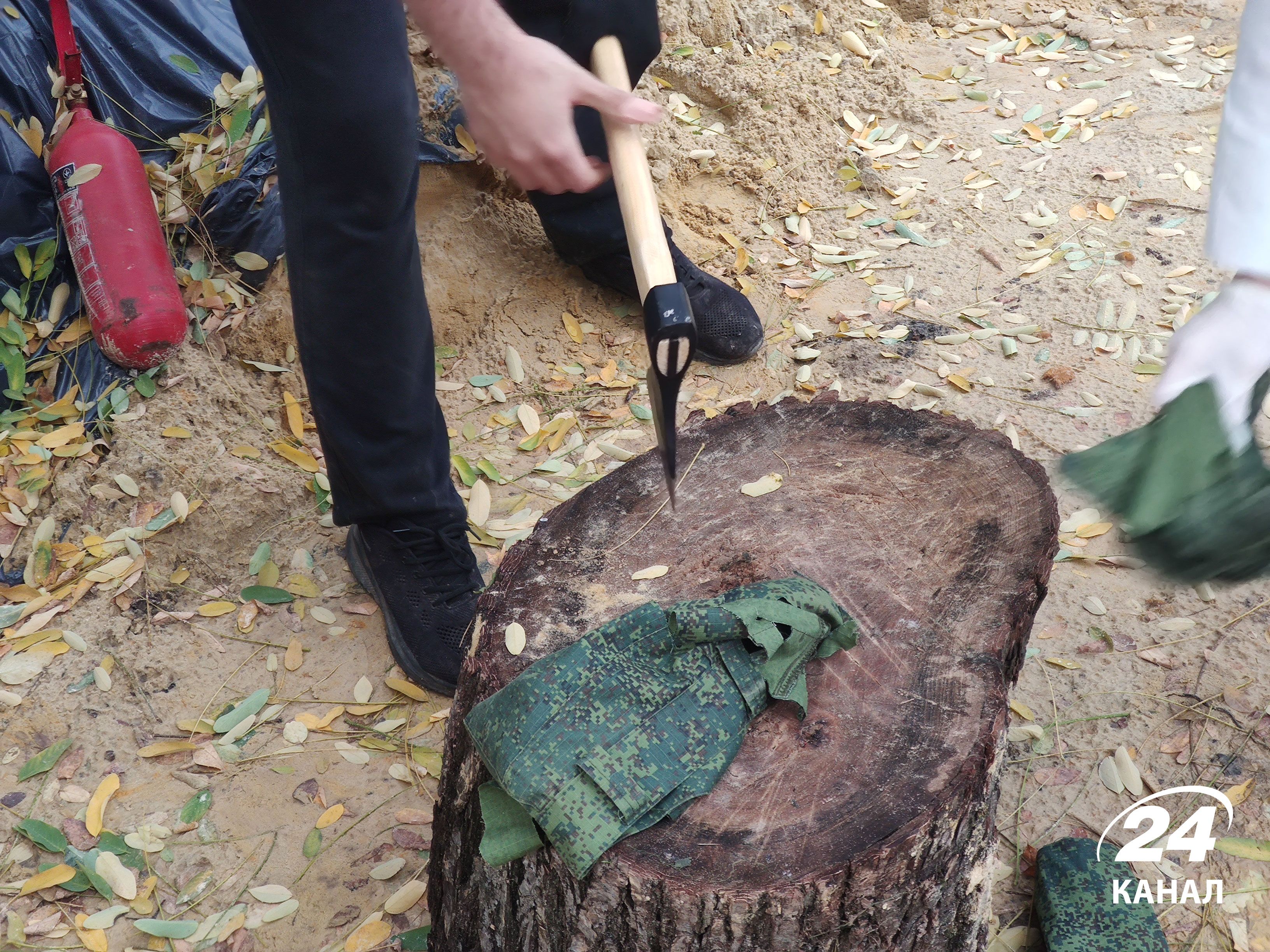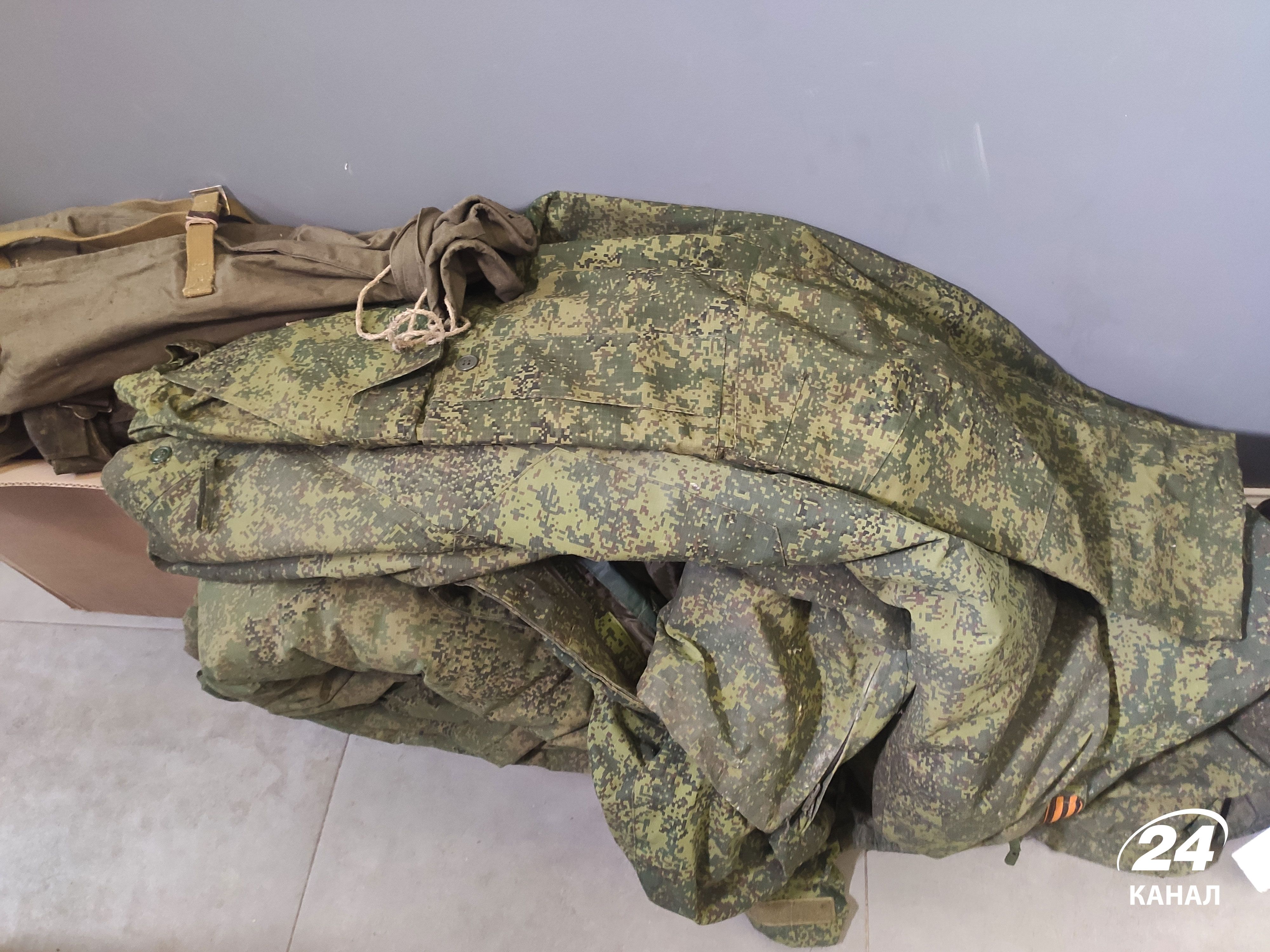 Оказывается, что оккупанты бросают не только драгоценную военную технику, но и форму. Волонтеры отмечают, что сначала топором рубят форму российских военных, после чего и плетут из нее сетки.