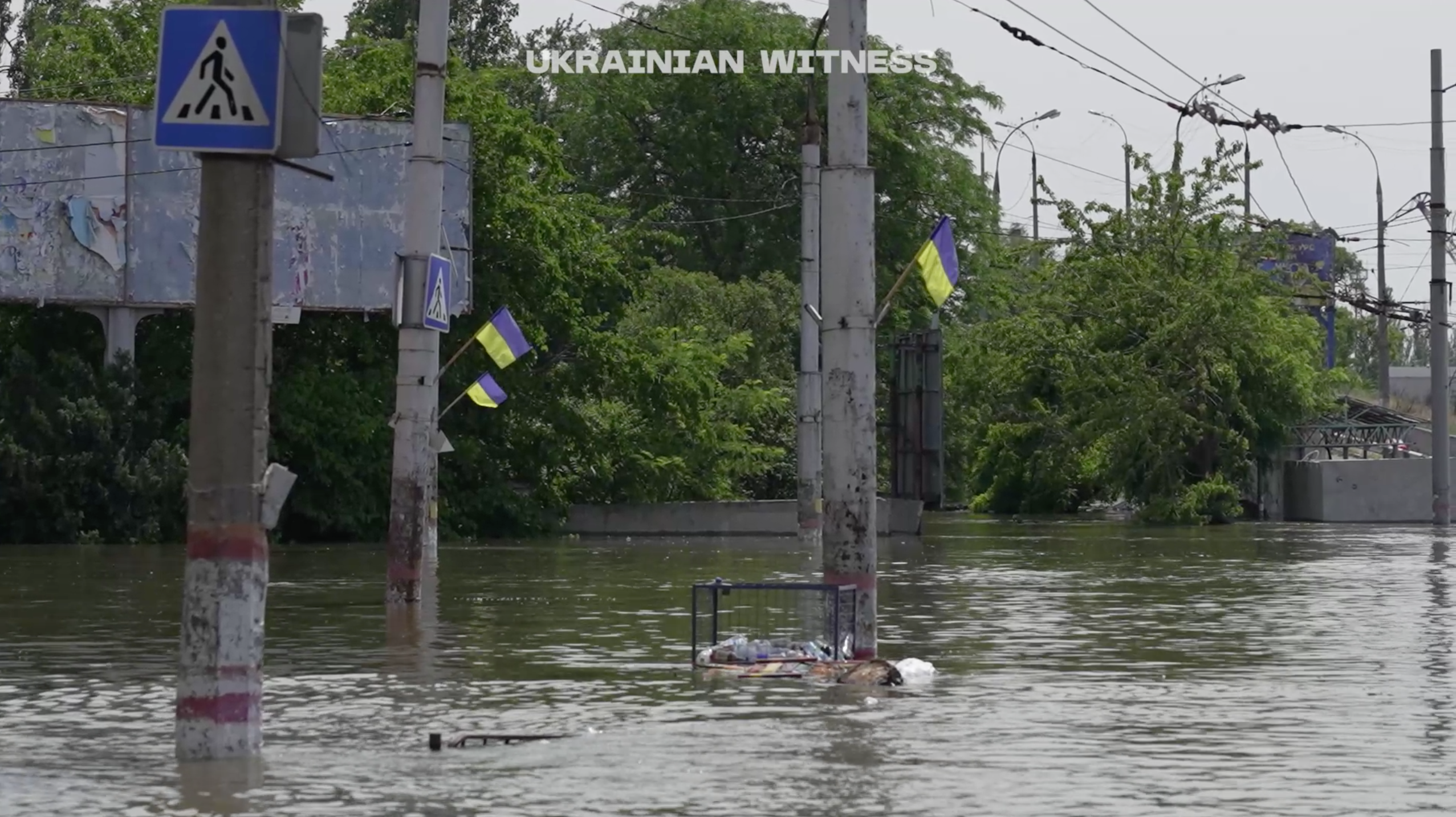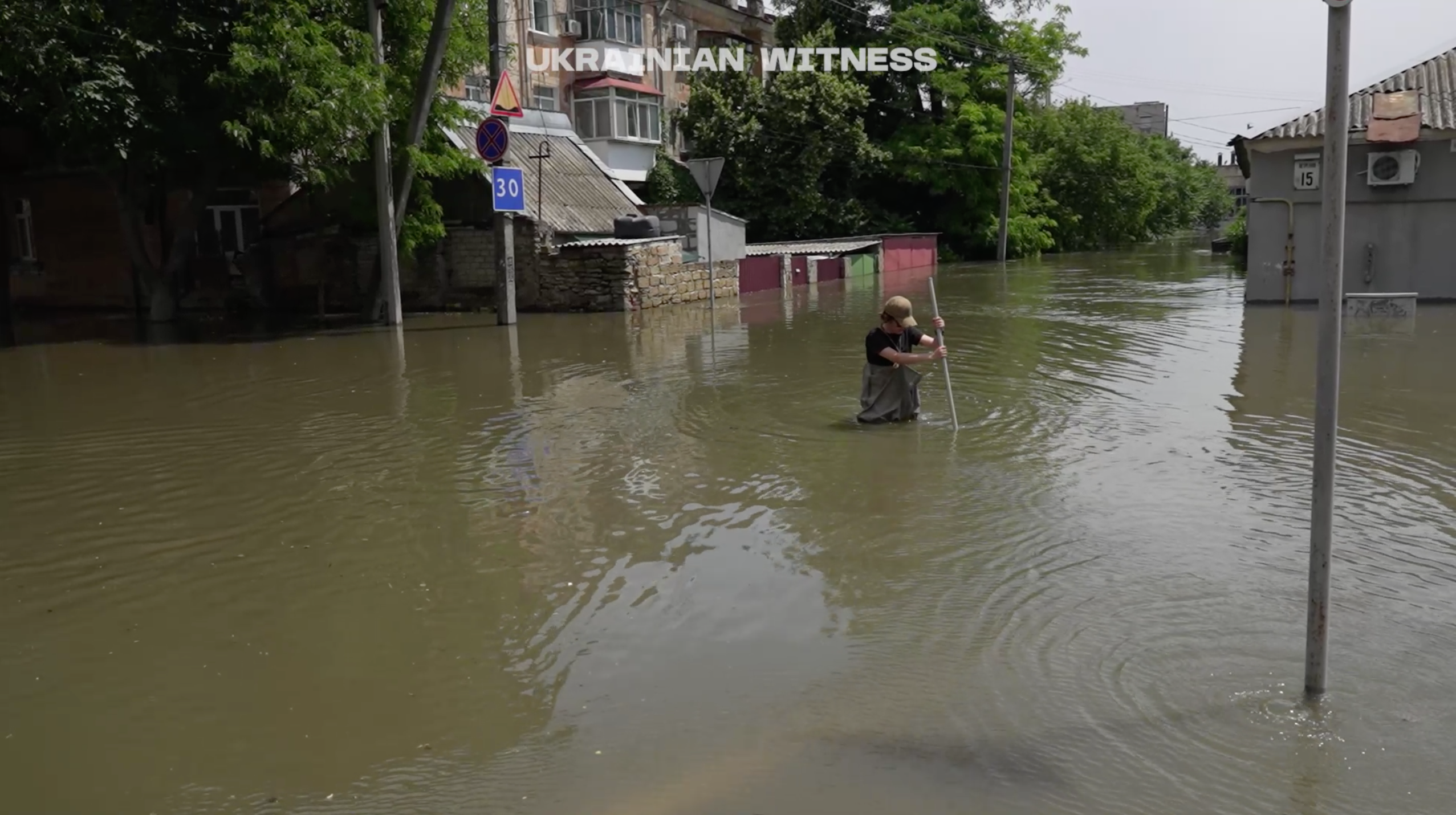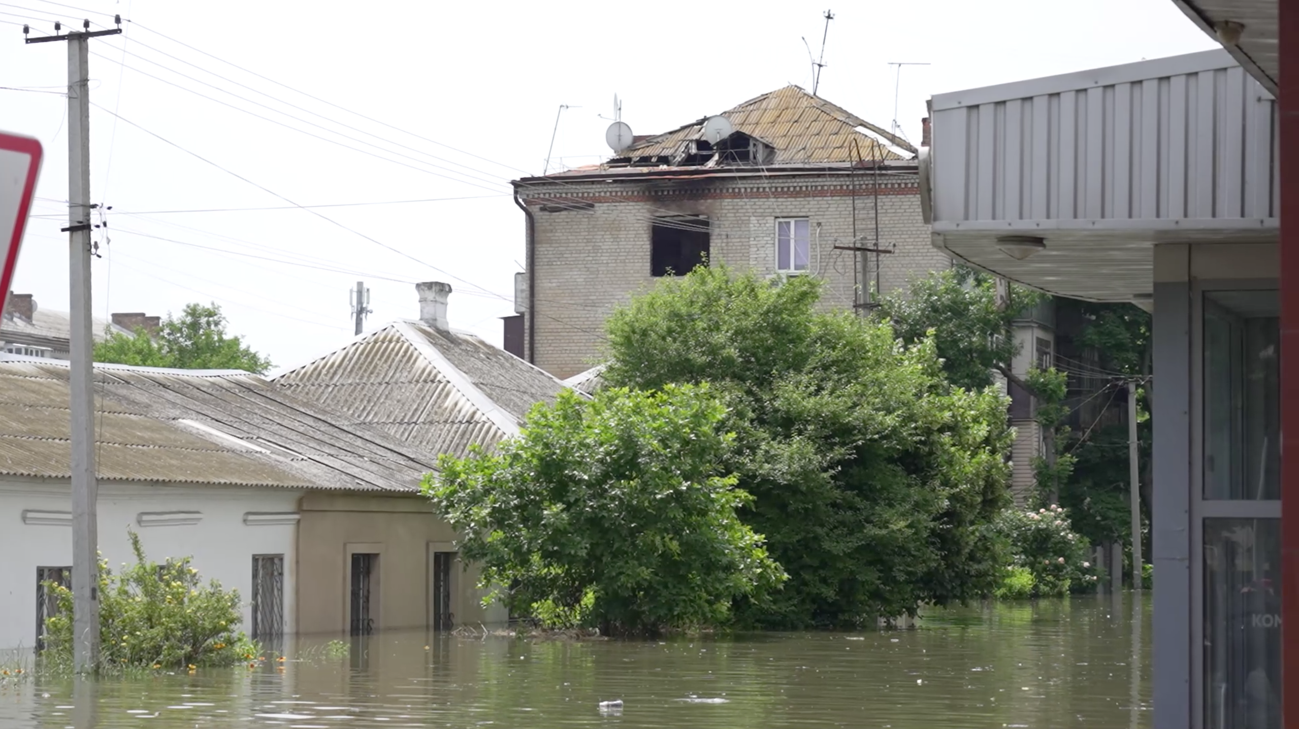 На подтопленных улицах работники ГСЧС и полиции эвакуируют местных жителей с сумками, пакетами и клетками с домашними животными. Среди эвакуированных также есть предприниматели, чей бизнес пострадал от преступных действий оккупантов.