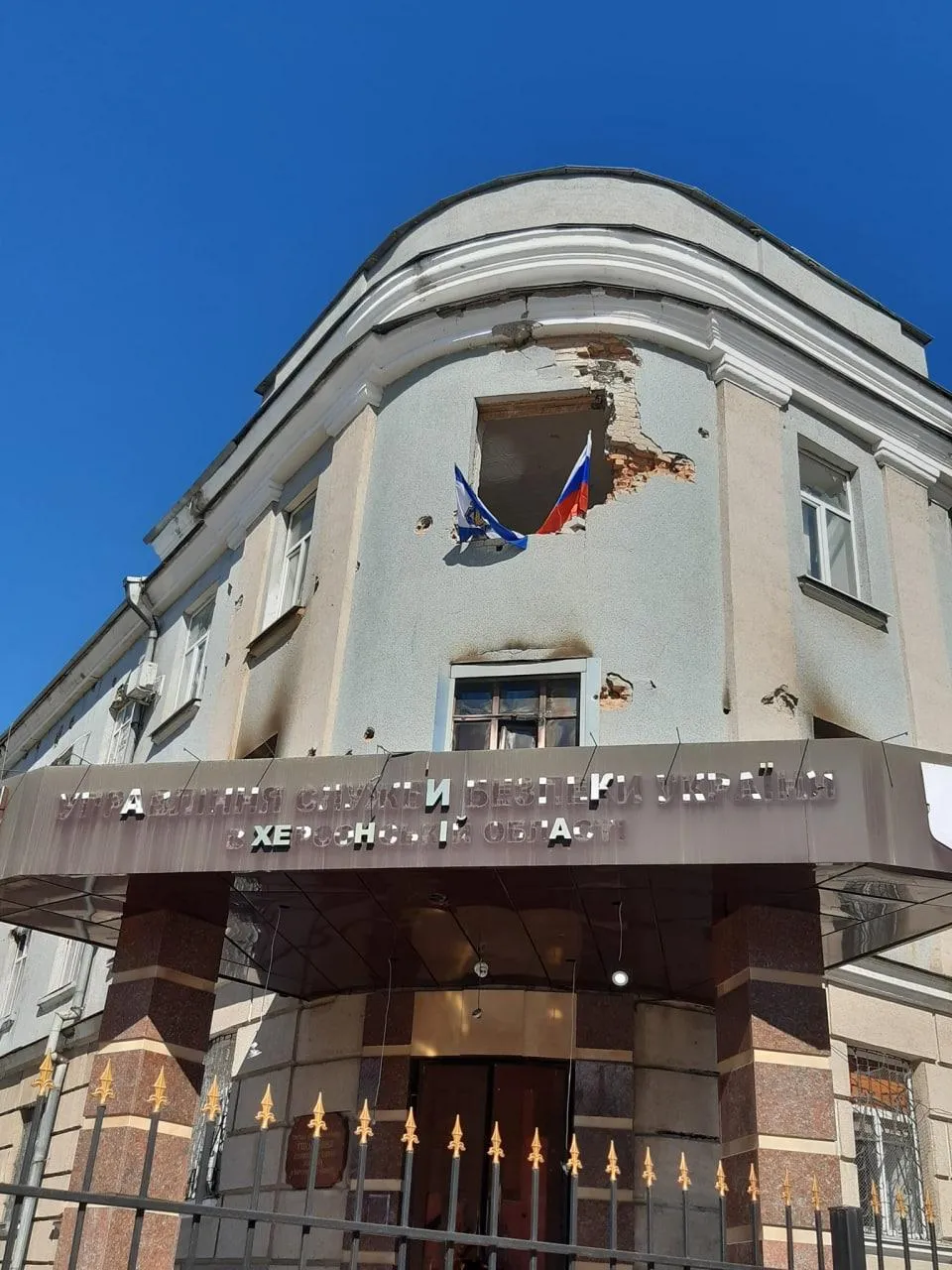 Россияне разбили в Херсоне здание управления Службы безопасности Украины. Враг 12 марта вывесил на нем свой флаг. Рядом развевается и флаг города.