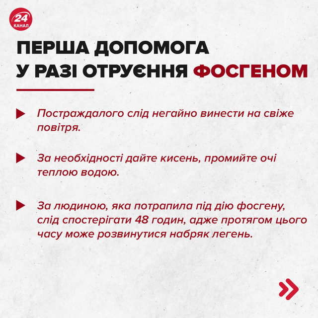 Пострадавшего нужно немедленно вынести на свежий воздух. При необходимости дать кислород и промыть глаза теплой водой. За человеком, пораженным действием фосгена, следует наблюдать 48 часов, ведь в течение этого времени может развиться отек легких, что является крайне опасным явлением и угрозой для жизни.