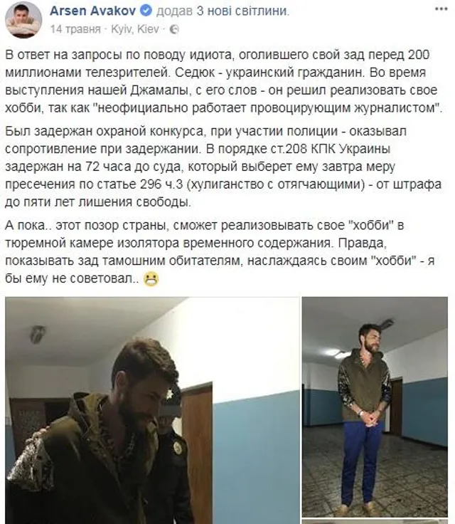 Не прошло и полгода как Аваков насторожил заявлением, в котором едва ли не прямо потешался над изнасилованиями в тюрьмах. В частности, в Facebook чиновник опубликовал фото пойманного пранкера Виталия Седюка, который оголил ягодицы во время Евровидения. Запись Аваков дополнил намеком на то, что пранкера в месте лишения свободы могут изнасиловать.