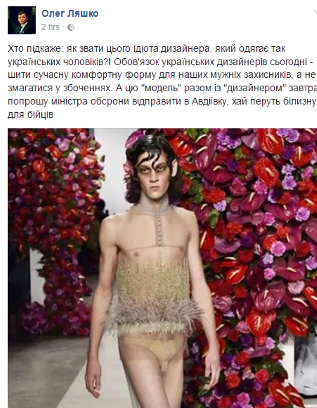 "Кто подскажет: как зовут этого идиота дизайнера, который одевает так украинских мужчин?! Обязанность украинских дизайнеров сегодня – шить современную комфортную форму для наших мужественных защитников, а не соревноваться в извращениях. А эту "модель" вместе с "дизайнером" завтра попрошу министра обороны отправить в Авдеевку, пусть стирают белье для бойцов", – народный депутат, лидер Радикальной партии Олег Ляшко.